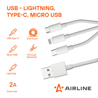 Универсальный кабель для зарядки смартфона 3 в 1 AIRLINE, оснащённый всеми необходимыми разъемами: USB Type C, microUSB и Lightning! Этот кабель — идеальное решение для водителей и путешественников, которые ценят комфорт и функциональность.