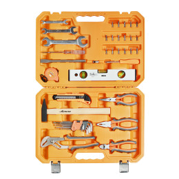 Ключ рожковый 8х10, 13х17, 19х24Рулетка 3мМолоток слесарный 300грПлоскогубцы комбинированные 180ммКлещи переставные универсальные 250ммДлинногубцы 165ммБокорезы 170ммЗубило 200х15ммНабор ключей шестигранных 1.5, 2, 2.5, 3, 4, 5, 6, 8, 10Нож универсальный, эргономичный 165ммОтверточная рукоятка 1/4"Держатель для бит 1/4" - 6,35ммБита PZ PZ 1, PZ 2, PZ 3Бита TORX TX8, TX 10, TX 15, TX 20, TX 25, TX 27, TX 30, TX 40Бита PH PH 1, PH 2, PH 3Бита шлиц 0.6 x 4.5, 1.2 x 6.5, 1.2 x 8.0Уровень алюминиевый 300ммИндикаторная отвертка 250ВФонарик светодиодный на батарейках