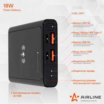 Портативное зарядное устройство нового поколения позволит зарядить ваш смартфон в любом месте. Аккумулятор оснащен беспроводной зарядкой стандарта Qi, мощностью до 10 Вт. Устройство поддерживает стандарт быстрой зарядки Power Delivery. Максимальная выходная мощность при зарядке через порт USB Type-C - 18 Вт, что позволяет заряжать некоторые модели ноутбуков, оснащенные данным разъемом. Аккумулятор имеет надежный алюминиевый корпус. Светодиодный индикатор заряда поможет контролировать состояние заряда аккумулятора.