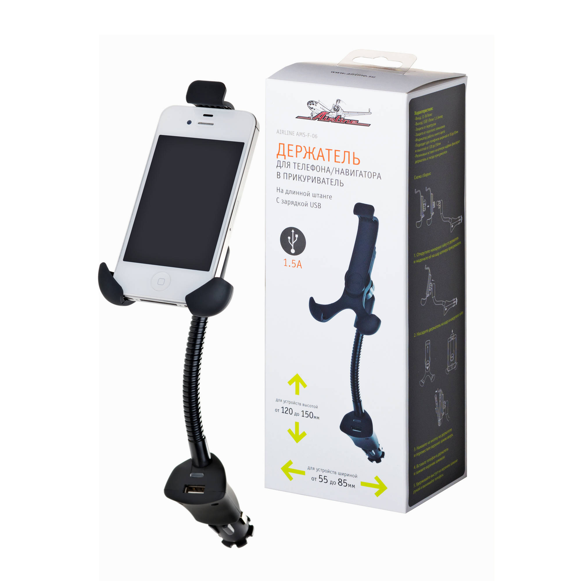 Держатель устанавливается в гнездо прикуривателя. Имеет несколько регулировок наклона. Резиновые накладки на прижимах надёжно удерживают устройство от выскальзывания.