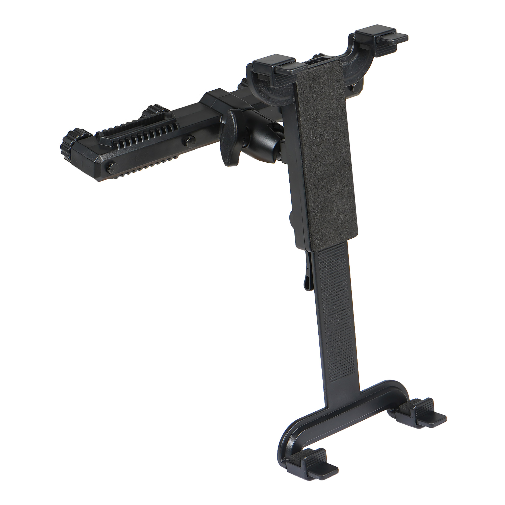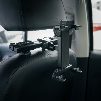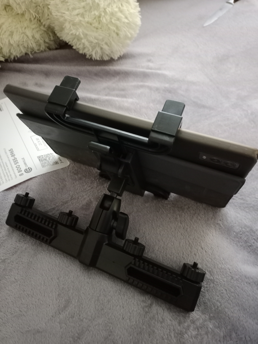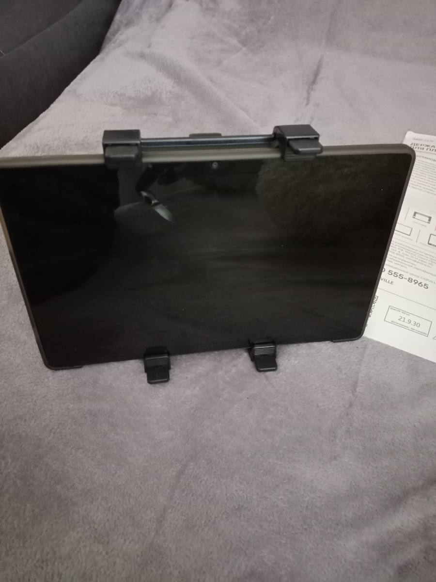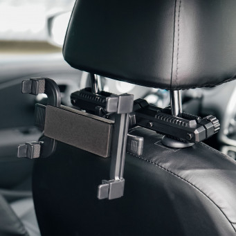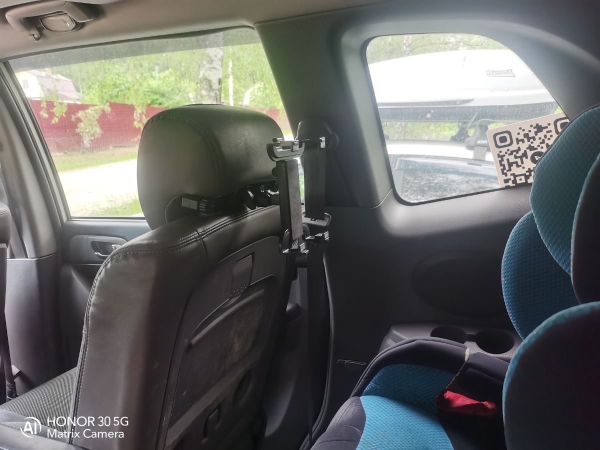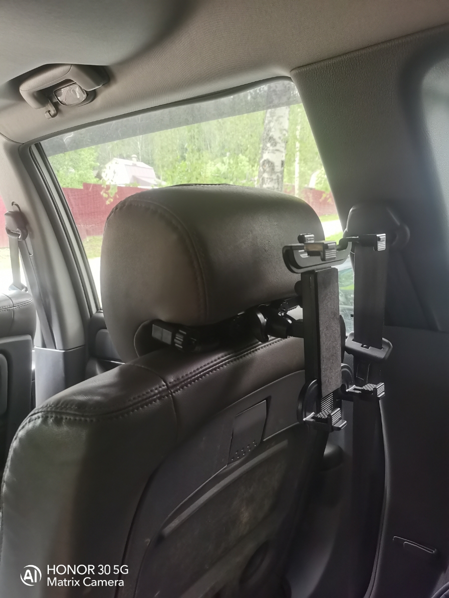 Держатель крепится на подголовник кресла. Имеет несколько регулировок наклона и способен удерживать не только смартфон но и планшет размером от 150 до 250мм. Резиновые накладки на прижимах надёжно удерживают устройство от выскальзывания.