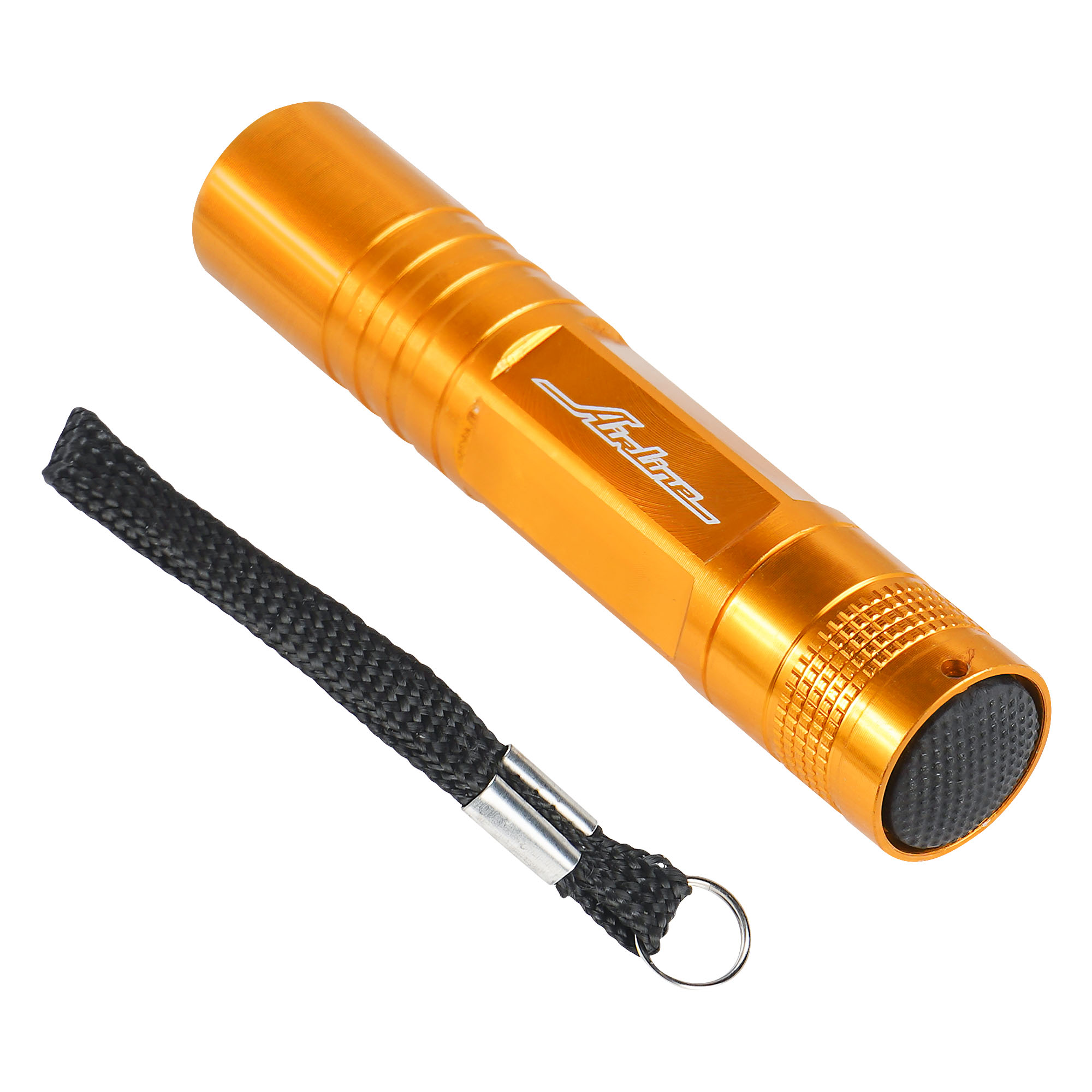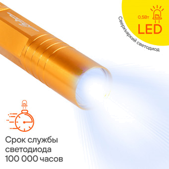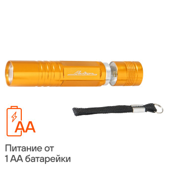 Компактный алюминиевый фонарик, благодаря своим компактным размерам, широко используется на бытовом уровне. Фонарик имеет корпус ярко-оранжевого цвета и удобный шнурок для переноски. Изделие питается от 1 батарейки типа АА.