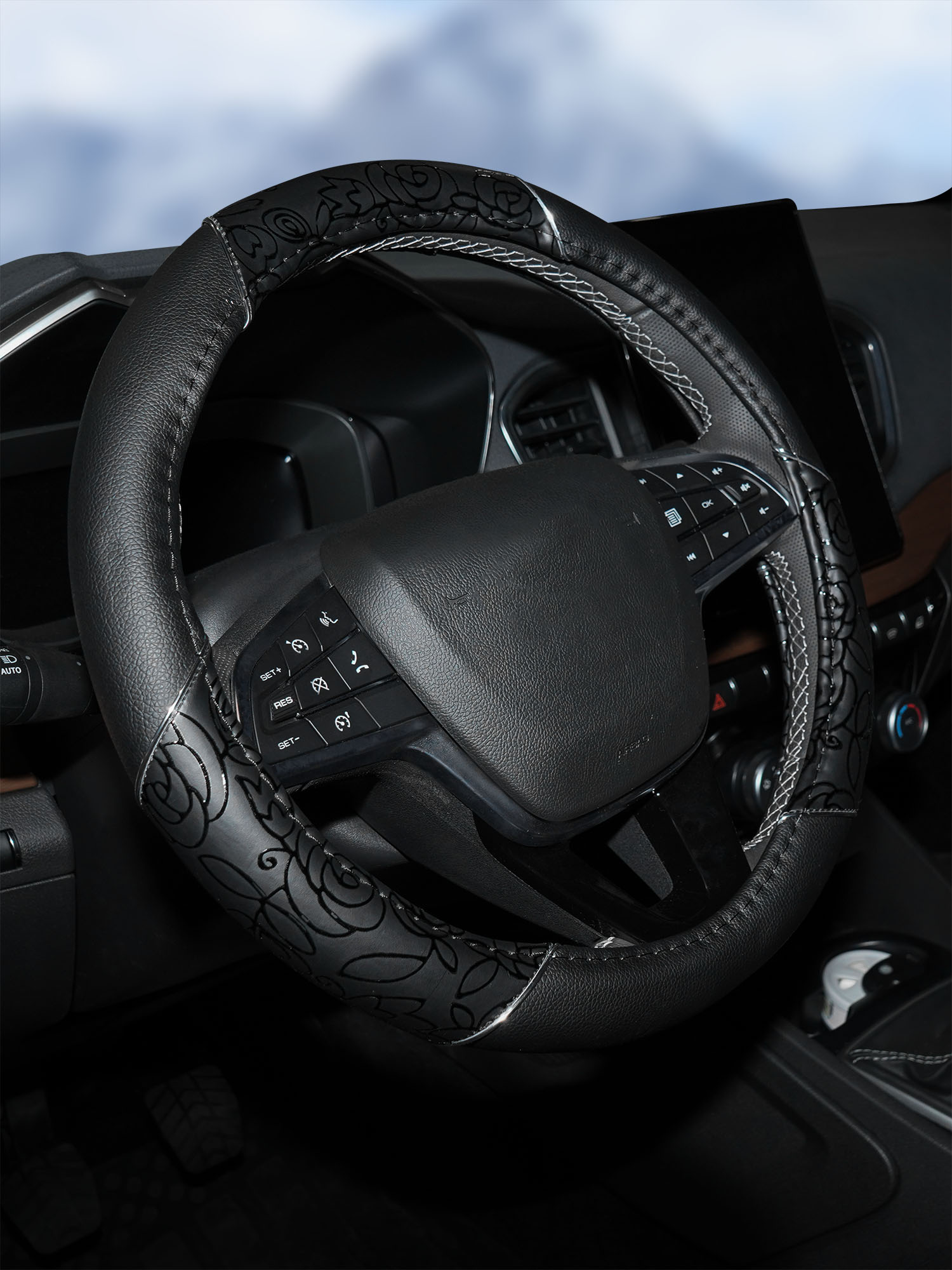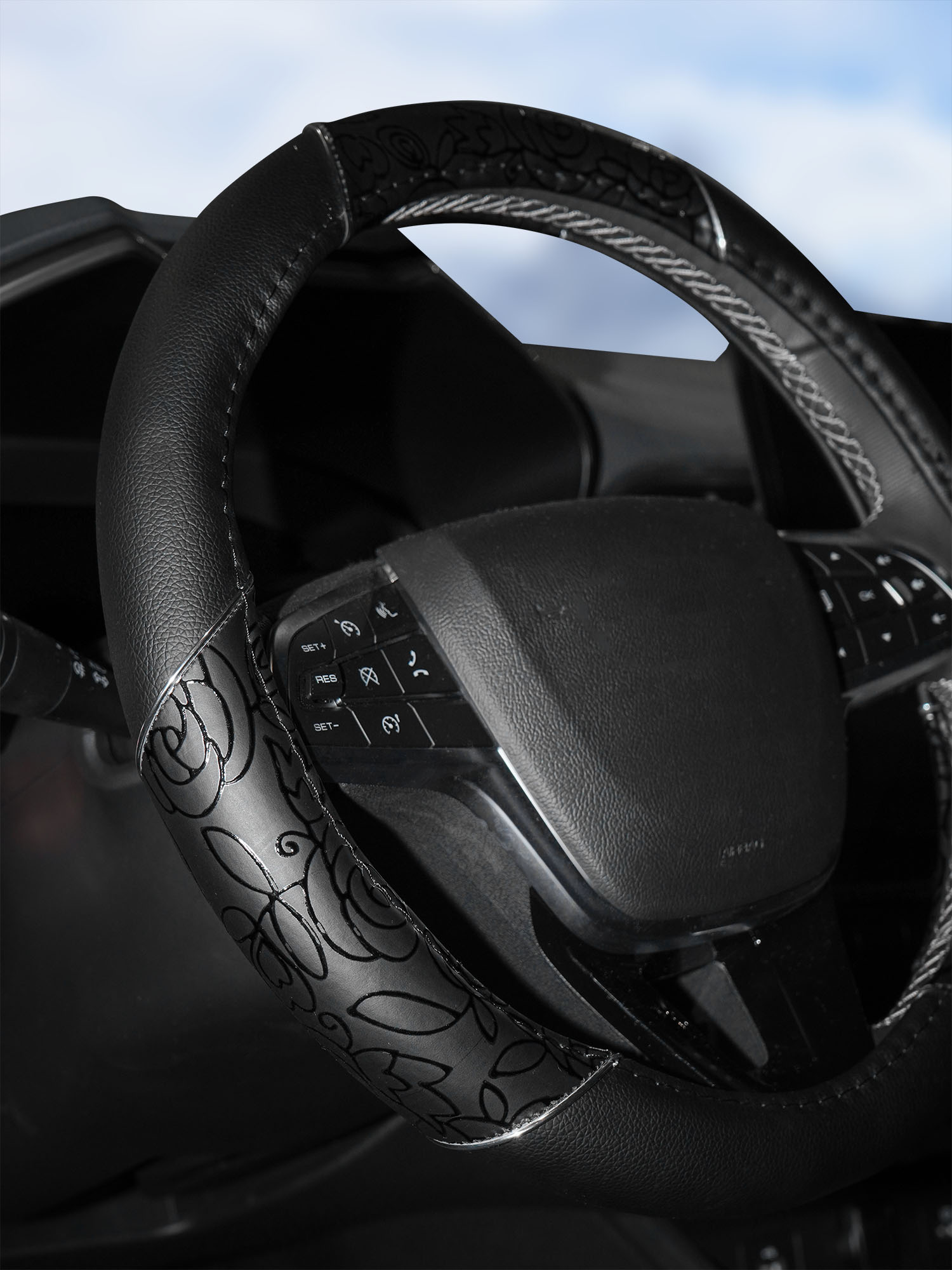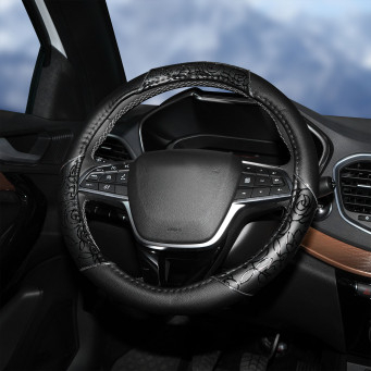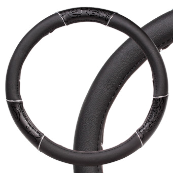 Оплетка размера L изготовлена из искусственной кожи, а также имеет стильный дизайн и черную расцветку. Отличительная особенность изделия – лаковые вставки и неброский принт на внешней стороне изделия. Модель идеально подойдет для женщины-автомобилиста и послужит украшением для салона машины.