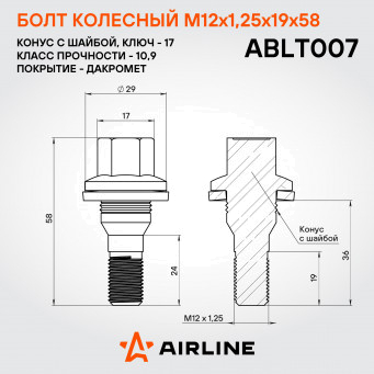 Надежный колесный болт AIRLINE ABLT007 M12x1,25x19x58, ключ 17 мм с конусной посадкой и шайбой – это прочный и долговечный метиз, обеспечивающий безопасность вашего автомобиля. Изготовлен из высококачественной стали, он выдерживает высокие нагрузки и устойчив к механическим воздействиям. Покрытие из дакромета обеспечивает превосходную защиту от коррозии, продлевая срок службы изделия даже в самых суровых условиях эксплуатации.