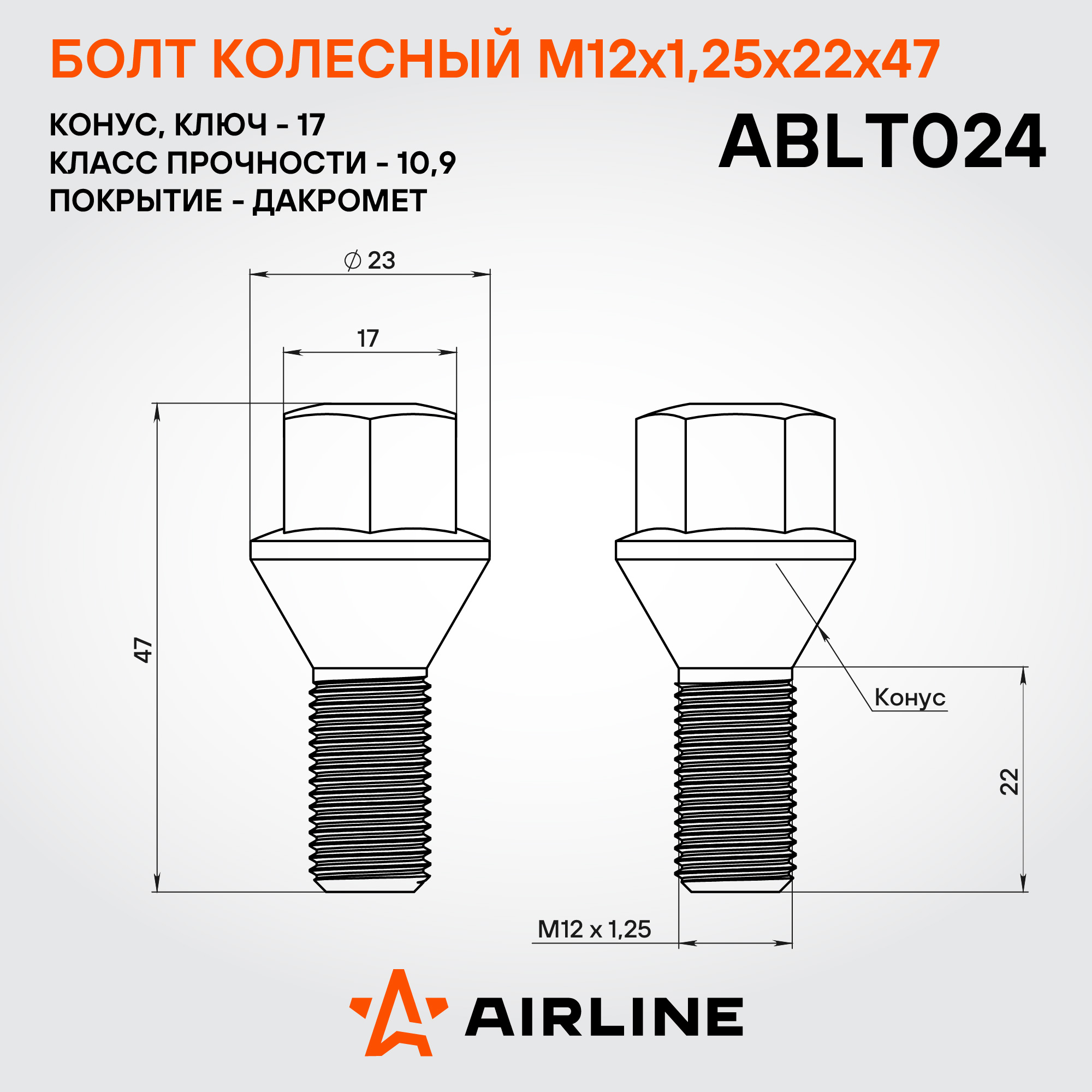 Надежный колесный болт AIRLINE ABLT024 M12x1,25x22x47, ключ 17 мм с конической посадкой – это прочный и долговечный метиз, обеспечивающий безопасность вашего автомобиля. Изготовлен из высококачественной стали, он выдерживает высокие нагрузки и устойчив к механическим воздействиям. Покрытие из дакромета обеспечивает превосходную защиту от коррозии, продлевая срок службы изделия даже в самых суровых условиях эксплуатации.