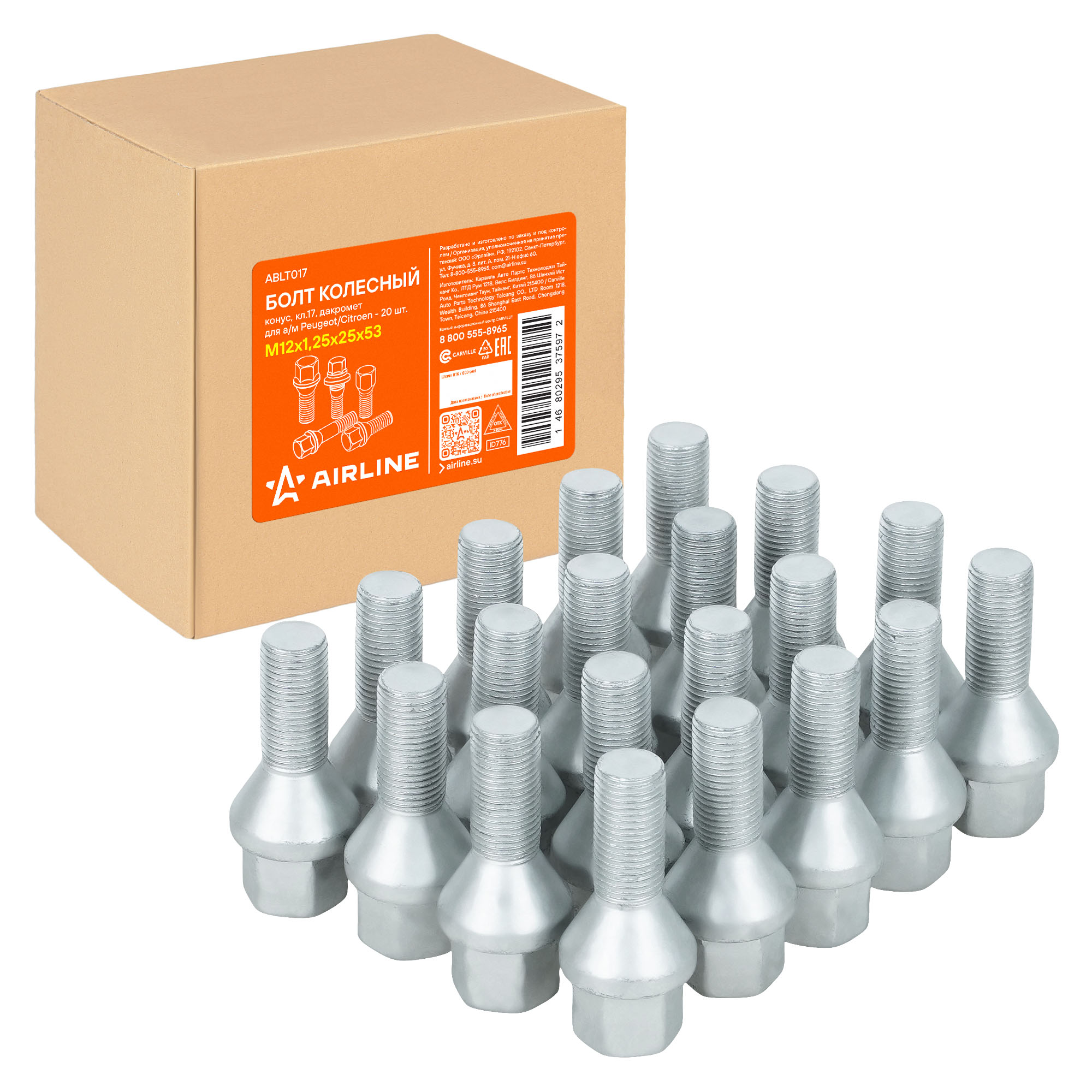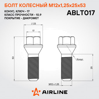 Надежный колесный болт AIRLINE ABLT017 M12x1,25x25x53, ключ 17 мм с конической посадкой – это прочный и долговечный метиз, обеспечивающий безопасность вашего автомобиля. Изготовлен из высококачественной стали, он выдерживает высокие нагрузки и устойчив к механическим воздействиям. Покрытие из дакромета обеспечивает превосходную защиту от коррозии, продлевая срок службы изделия даже в самых суровых условиях эксплуатации.
