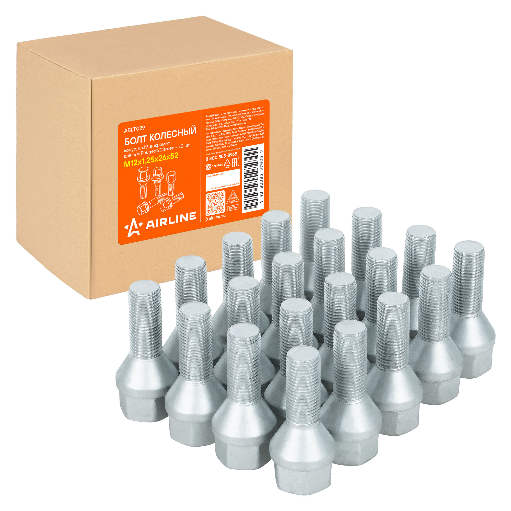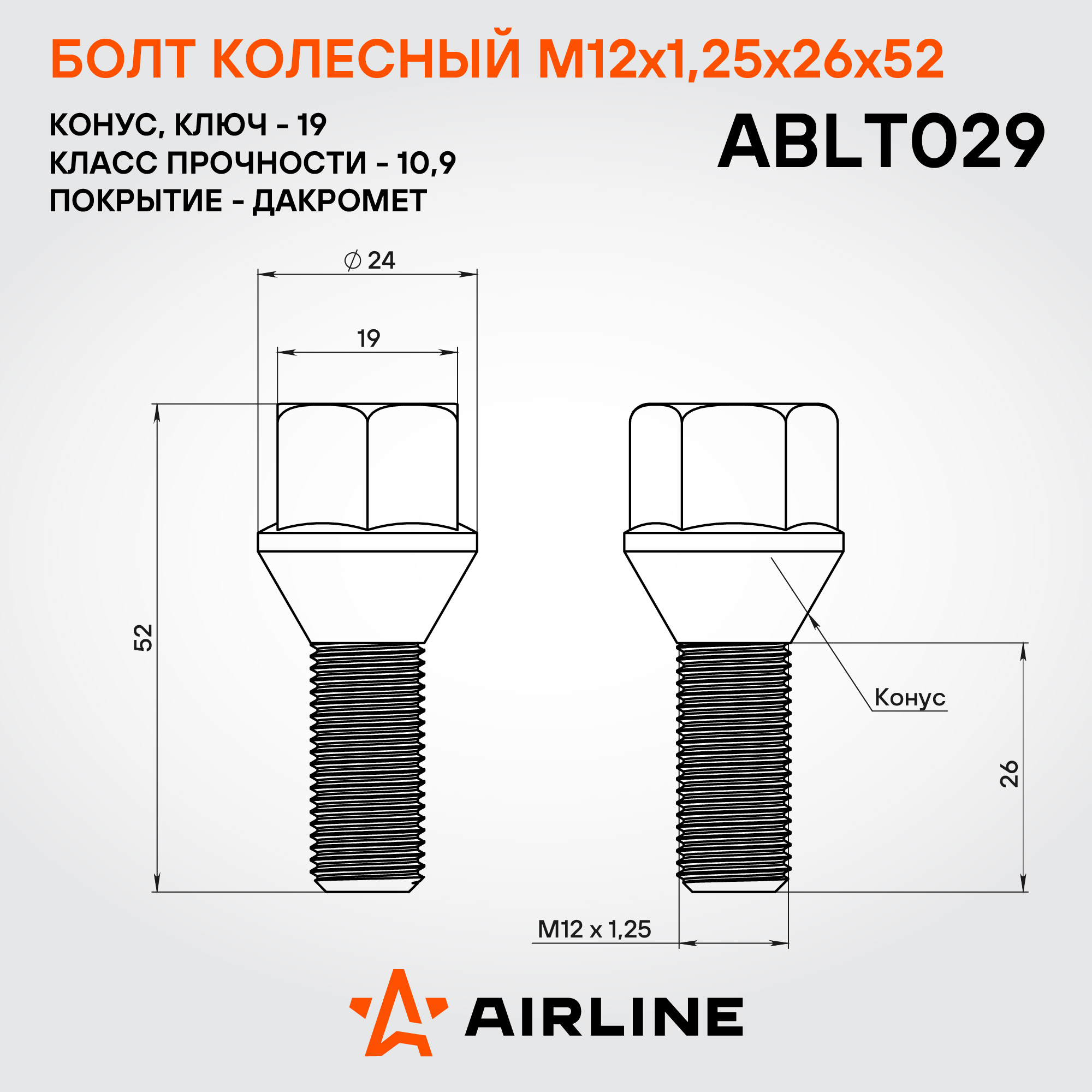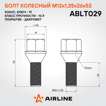 Надежный колесный болт AIRLINE ABLT029 M12x1,25x26x52, ключ 19 мм с конической посадкой – это прочный и долговечный метиз, обеспечивающий безопасность вашего автомобиля. Изготовлен из высококачественной стали, он выдерживает высокие нагрузки и устойчив к механическим воздействиям. Покрытие из дакромета обеспечивает превосходную защиту от коррозии, продлевая срок службы изделия даже в самых суровых условиях эксплуатации.