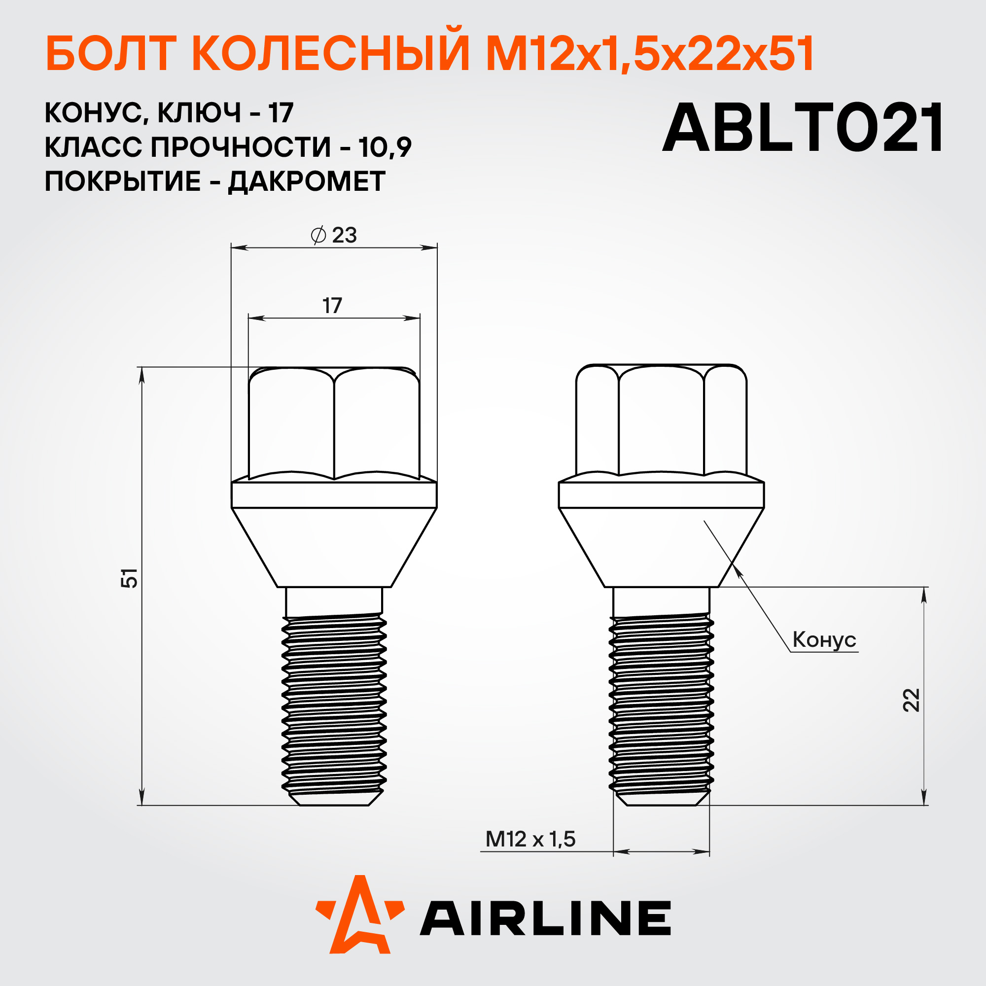 Надежный колесный болт AIRLINE ABLT021 M12x1,5x22x51, ключ 17 мм с конической посадкой – это прочный и долговечный метиз, обеспечивающий безопасность вашего автомобиля. Изготовлен из высококачественной стали, он выдерживает высокие нагрузки и устойчив к механическим воздействиям. Покрытие из дакромета обеспечивает превосходную защиту от коррозии, продлевая срок службы изделия даже в самых суровых условиях эксплуатации.