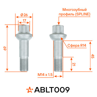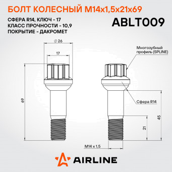 Надежный колесный болт AIRLINE ABLT009 M14x1,5x21x69, spline с сферической посадкой R14 – это прочный и долговечный метиз, обеспечивающий безопасность вашего автомобиля. Изготовлен из высококачественной стали, он выдерживает высокие нагрузки и устойчив к механическим воздействиям. Покрытие из дакромета обеспечивает превосходную защиту от коррозии, продлевая срок службы изделия даже в самых суровых условиях эксплуатации.