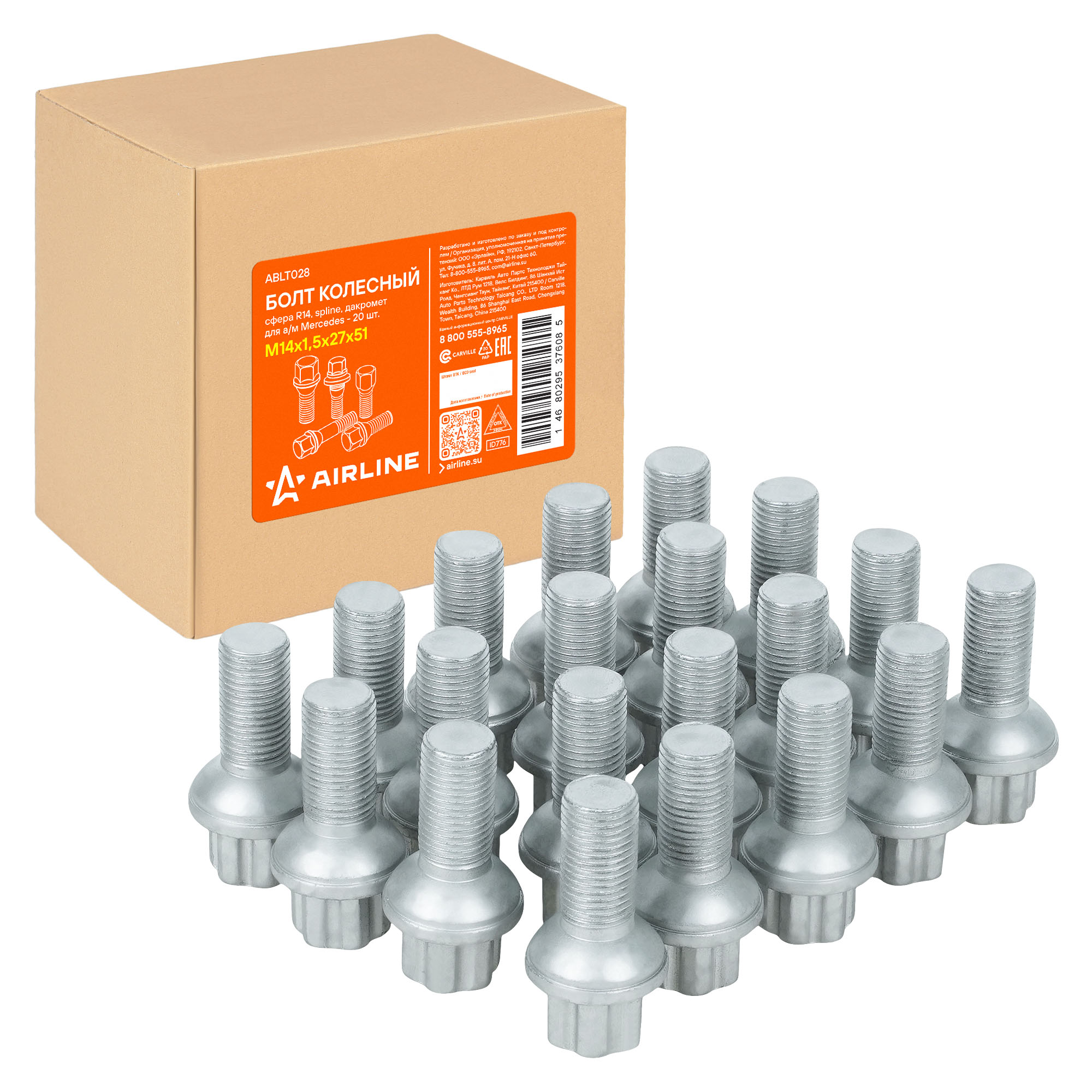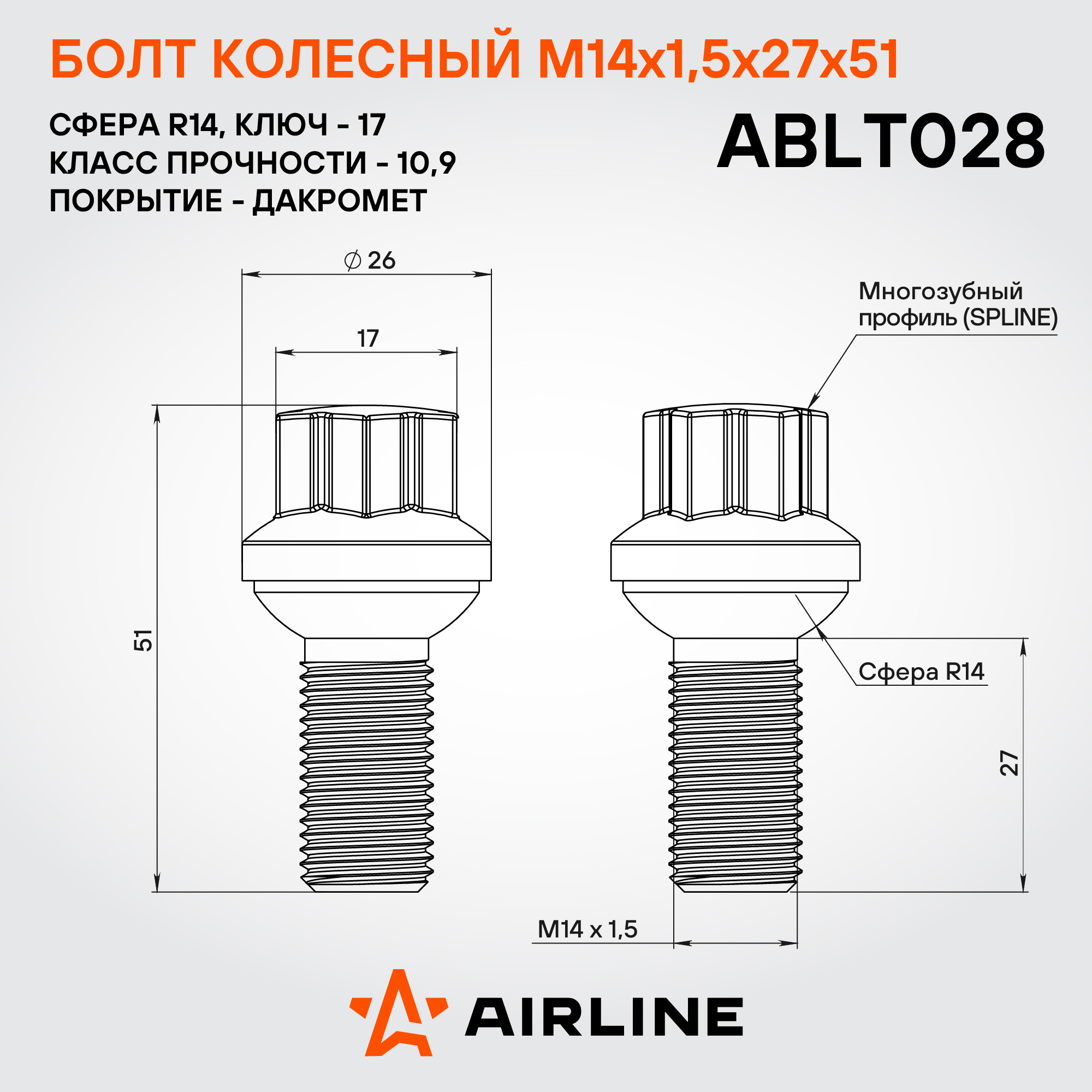 Надежный колесный болт AIRLINE ABLT028 M14x1,5x27x51, spline с сферической посадкой R14 – это прочный и долговечный метиз, обеспечивающий безопасность вашего автомобиля. Изготовлен из высококачественной стали, он выдерживает высокие нагрузки и устойчив к механическим воздействиям. Покрытие из дакромета обеспечивает превосходную защиту от коррозии, продлевая срок службы изделия даже в самых суровых условиях эксплуатации.