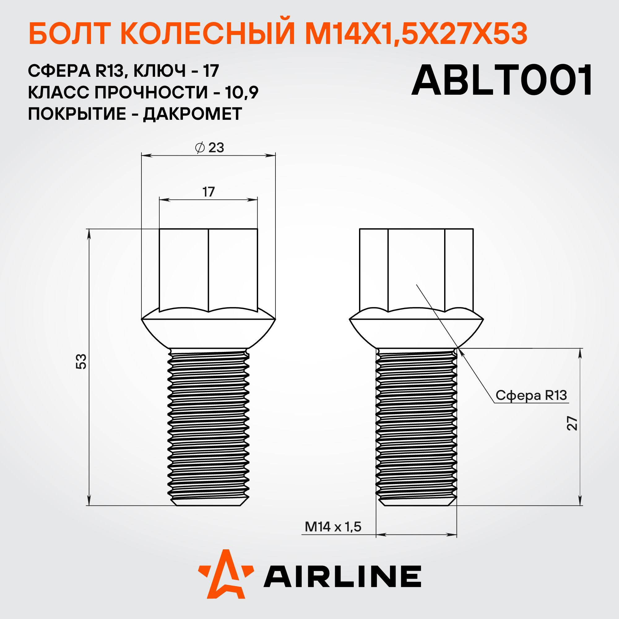 Надежный колесный болт AIRLINE ABLT001 M14x1,5x27x48, ключ 17 мм и сферической посадкой R13 – это прочный и долговечный метиз, обеспечивающий безопасность вашего автомобиля. Изготовленный из высококачественной стали, он выдерживает высокие нагрузки и устойчив к механическим воздействиям. Покрытие из дакромета обеспечивает превосходную защиту от коррозии, продлевая срок службы изделия даже в самых суровых условиях эксплуатации.