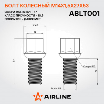 Оптимизированная конструкция болта гарантирует надежную фиксацию без люфта и ослабления соединения, а плавный ход резьбы облегчает установку. Выбирая колесный болт AIRLINE, вы обеспечиваете своему автомобилю надежность и долговечность крепежных элементов.