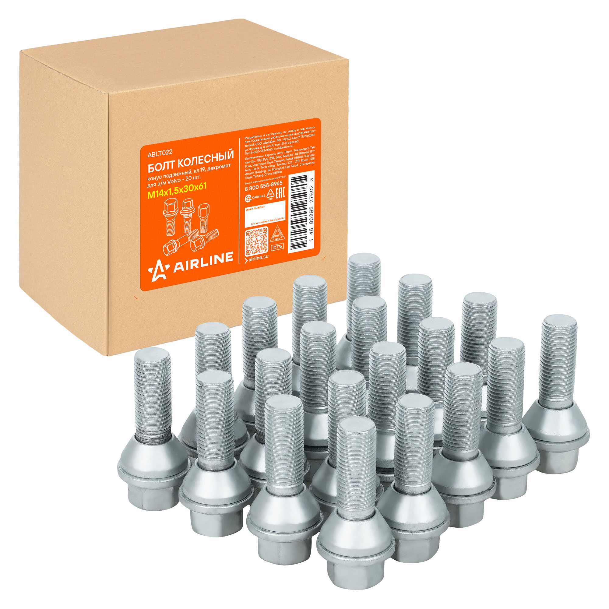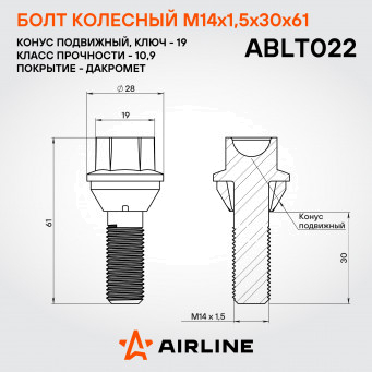 Надежный колесный болт AIRLINE ABLT022 M14x1,5x30x61, ключ 19 мм с подвижной конической посадкой – это прочный и долговечный метиз, обеспечивающий безопасность вашего автомобиля. Изготовлен из высококачественной стали, он выдерживает высокие нагрузки и устойчив к механическим воздействиям. Покрытие из дакромета обеспечивает превосходную защиту от коррозии, продлевая срок службы изделия даже в самых суровых условиях эксплуатации.