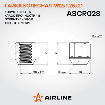 Надежная колесная гайка AIRLINE ASCR028 M12x1,25x21 с конусной посадкой и ключом на 17 мм – это компактный и прочный элемент колесного крепежа, обеспечивающий надёжную фиксацию. Стальной корпус выдерживает высокие нагрузки, а хромовое покрытие эффективно противостоит коррозии и придает эстетичный вид.
