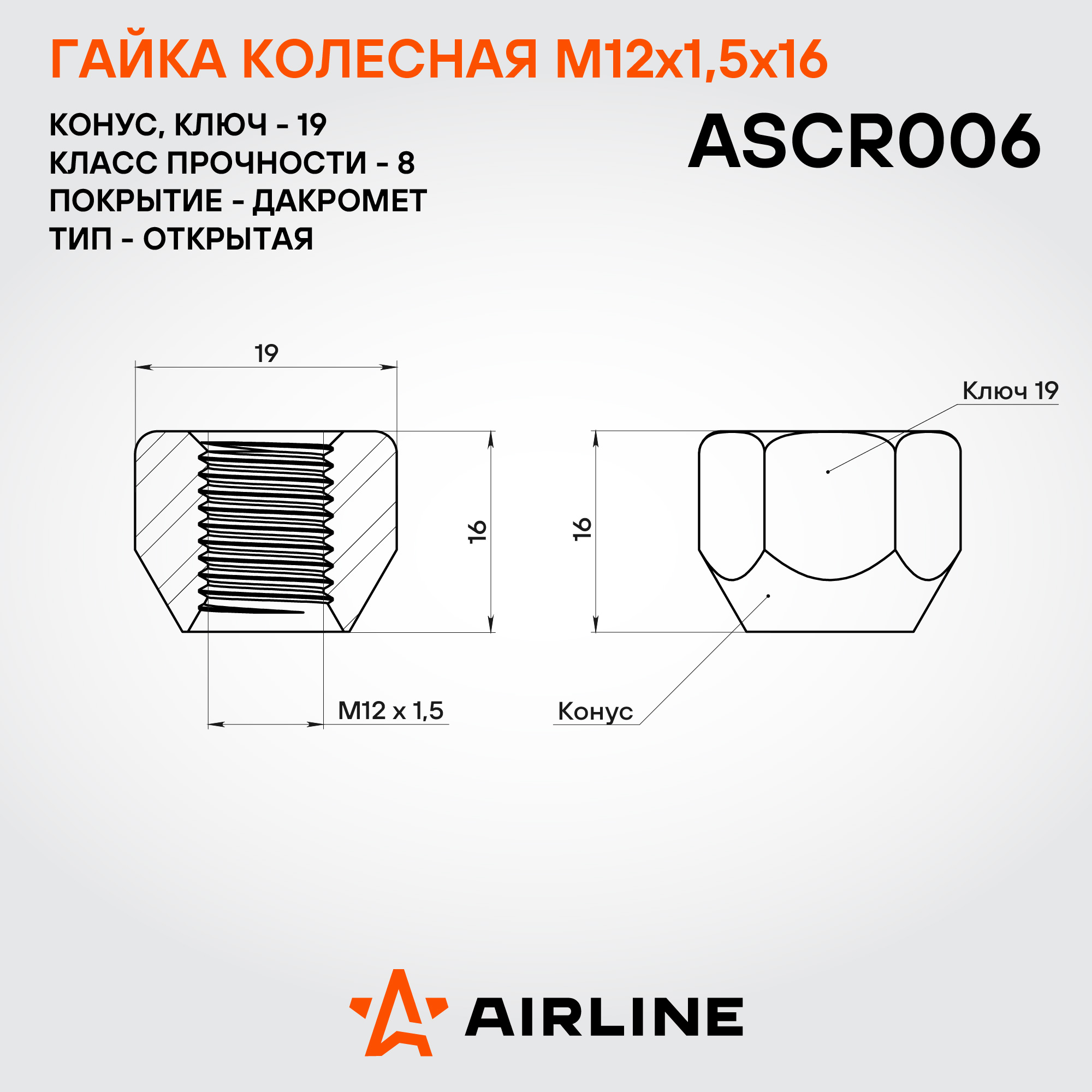 Гайка для колес открытого типа обеспечивает надежную фиксацию и подходит для различных типов дисков. Точная нарезка резьбы гарантирует легкую установку и прочное соединение без риска ослабления. Выбирая колесную гайку AIRLINE, вы получаете максимальную безопасность, надежность и долговечность крепежных элементов вашего автомобиля.