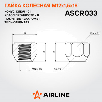 Гайка для колес открытого типа обеспечивает удобство при установке и совместимость с различными типами дисков. Точная нарезка резьбы гарантирует надёжную фиксацию и стабильную эксплуатацию. Выбирая колесную гайку AIRLINE, вы получаете максимальную безопасность, надёжность и долговечность крепежных элементов вашего автомобиля.