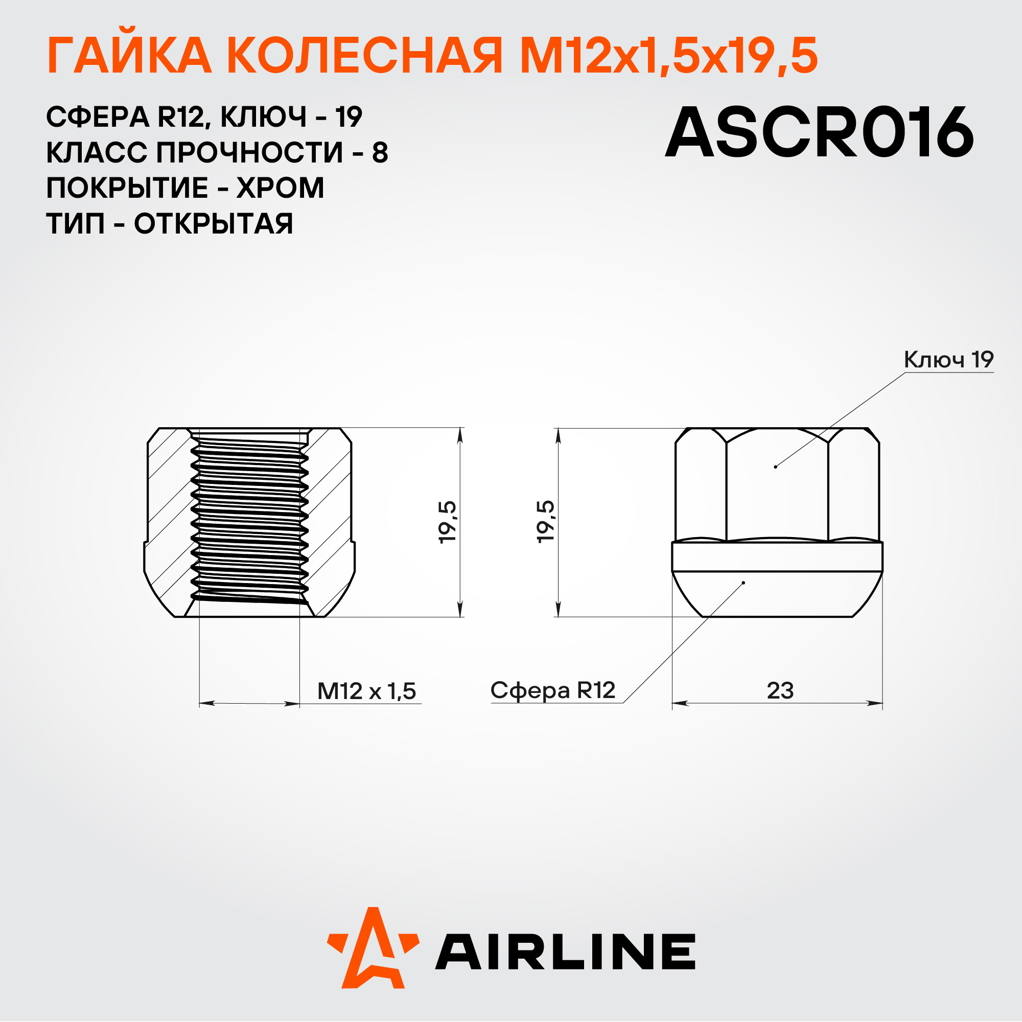 Гайка для колес открытого типа с посадкой сферического типа R12 обеспечивает надежную фиксацию и правильное распределение нагрузки. Точная нарезка резьбы гарантирует легкую установку и прочное соединение. Выбирая колесную гайку AIRLINE, вы получаете максимальную безопасность, надежность и долговечность крепежных элементов вашего автомобиля.