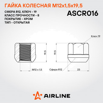 Надежная колесная гайка AIRLINE ASCR016 M12x1,5x19,5 с посадкой сфера R12 и ключом на 19 мм – это прочный и долговечный элемент колесного крепежа, обеспечивающий безопасность вашего автомобиля. Изготовленная из высококачественной стали, она выдерживает высокие нагрузки и устойчива к механическим воздействиям. Покрытие из хрома эффективно защищает от коррозии, придает эстетичный блеск и продлевает срок службы даже в сложных эксплуатационных условиях.