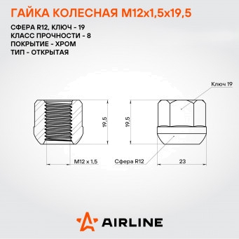 Гайка для колес открытого типа с посадкой сферического типа R12 обеспечивает надежную фиксацию и правильное распределение нагрузки. Точная нарезка резьбы гарантирует легкую установку и прочное соединение. Выбирая колесную гайку AIRLINE, вы получаете максимальную безопасность, надежность и долговечность крепежных элементов вашего автомобиля.