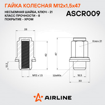 Надежная колесная гайка AIRLINE ASCR009 M12x1,5x47 с несъемной шайбой и ключом на 21 мм – это прочный и долговечный элемент колесного крепежа, обеспечивающий безопасность вашего автомобиля. Изготовленная из высококачественной стали, она выдерживает высокие нагрузки и устойчива к механическим воздействиям. Покрытие из хрома эффективно защищает от коррозии, придает эстетичный блеск и продлевает срок службы даже в условиях повышенной влажности и агрессивной среды.