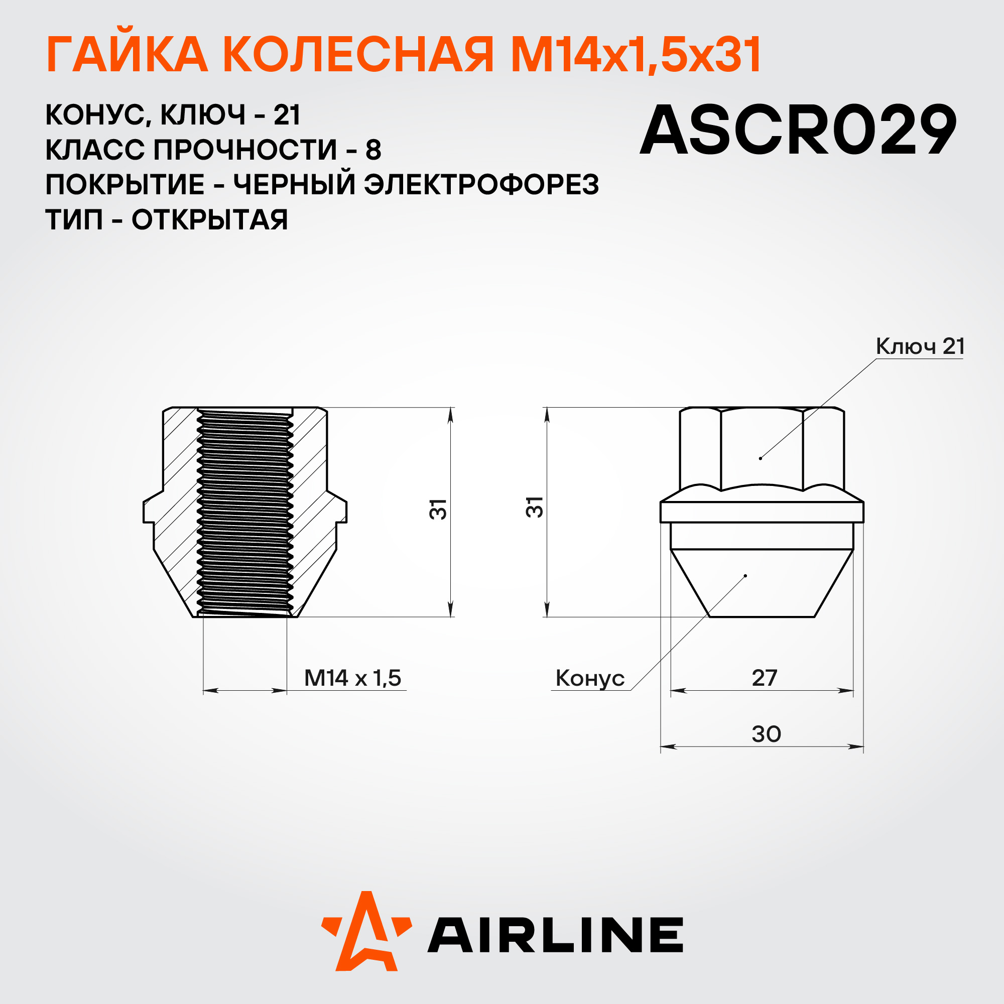 Надежная колесная гайка AIRLINE ASCR029 M14x1,5x31 с конусной посадкой и ключом на 21 мм – это прочный и функциональный элемент колесного крепежа, предназначенный для надёжного соединения. Изготовлена из прочной стали, устойчива к нагрузкам и повреждениям. Черное покрытие электрофорезом придает стильный внешний вид и повышенную устойчивость к коррозии.