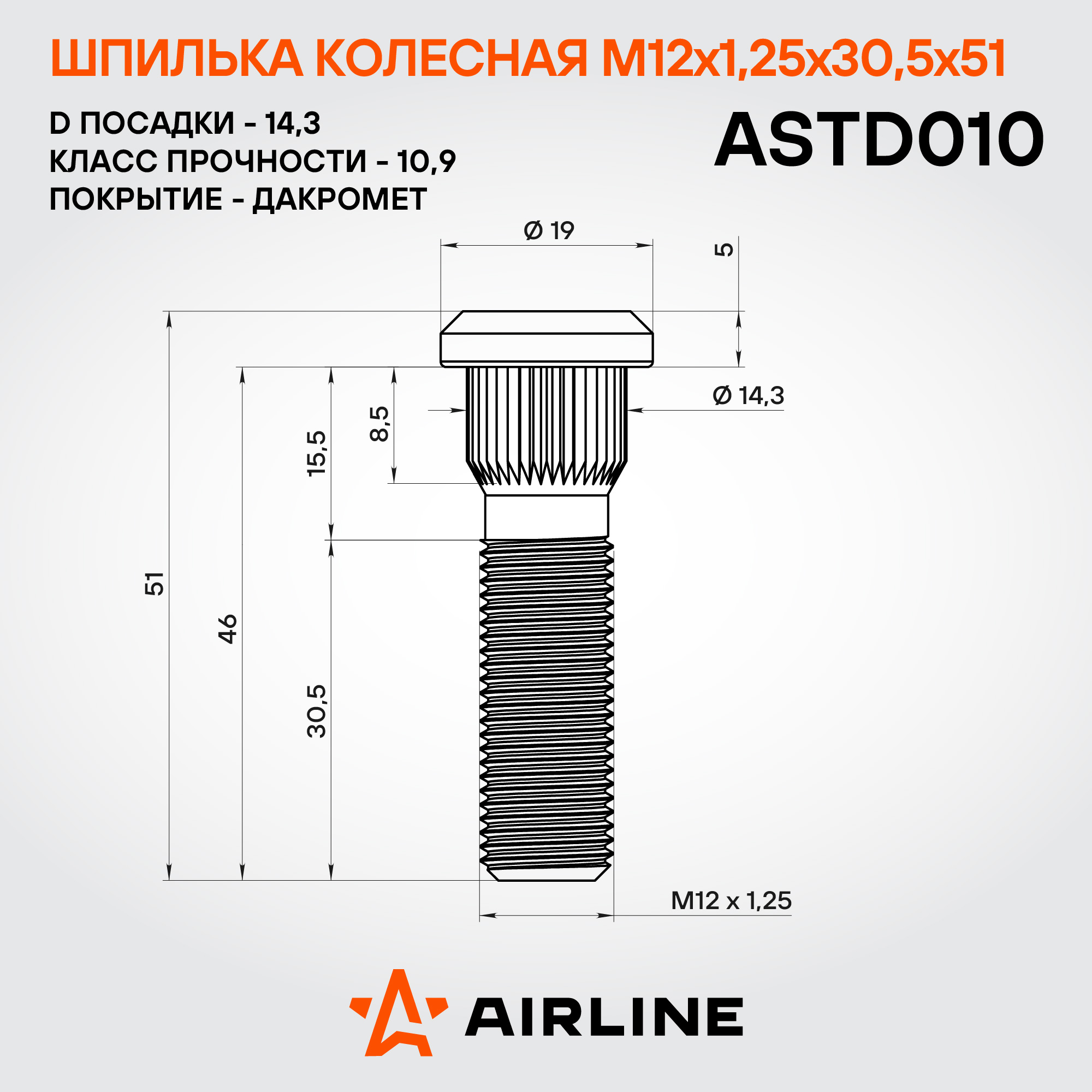 Колесная шпилька AIRLINE ASTD010 M12x1,25x30,5x51 с диаметром посадки 14,3 мм — это надежный крепежный элемент, предназначенный для прочной и безопасной фиксации колесного диска к ступице.