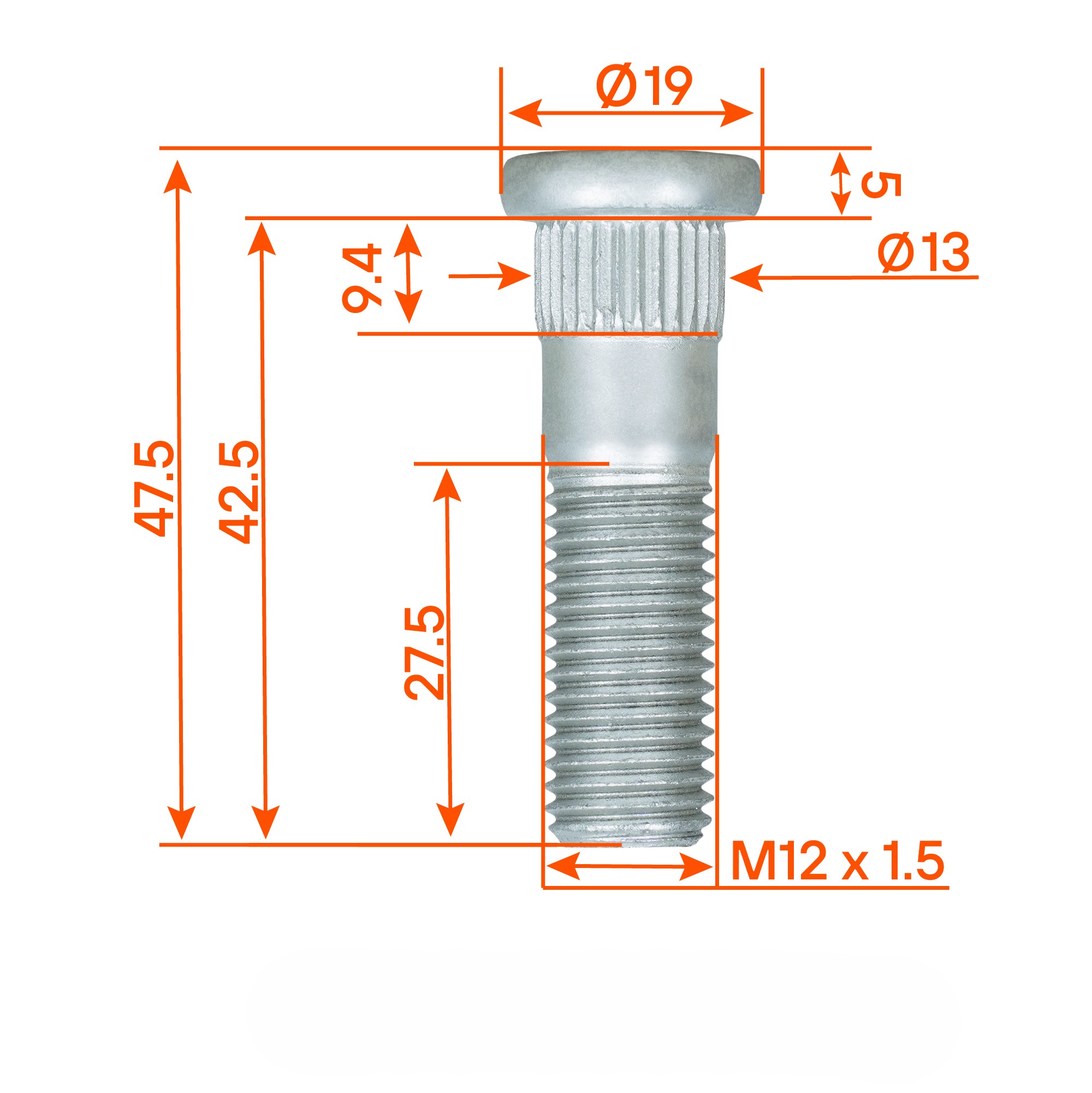 Оптимальные геометрические параметры обеспечивают идеальную посадку: резьба M12 x 1,5 длиной 27,5 мм обеспечивает легкое и точное соединение с гайкой, а шлицевая часть длиной 9,4 мм с диаметром 13 мм гарантирует надежную фиксацию в ступице без риска проворачивания.