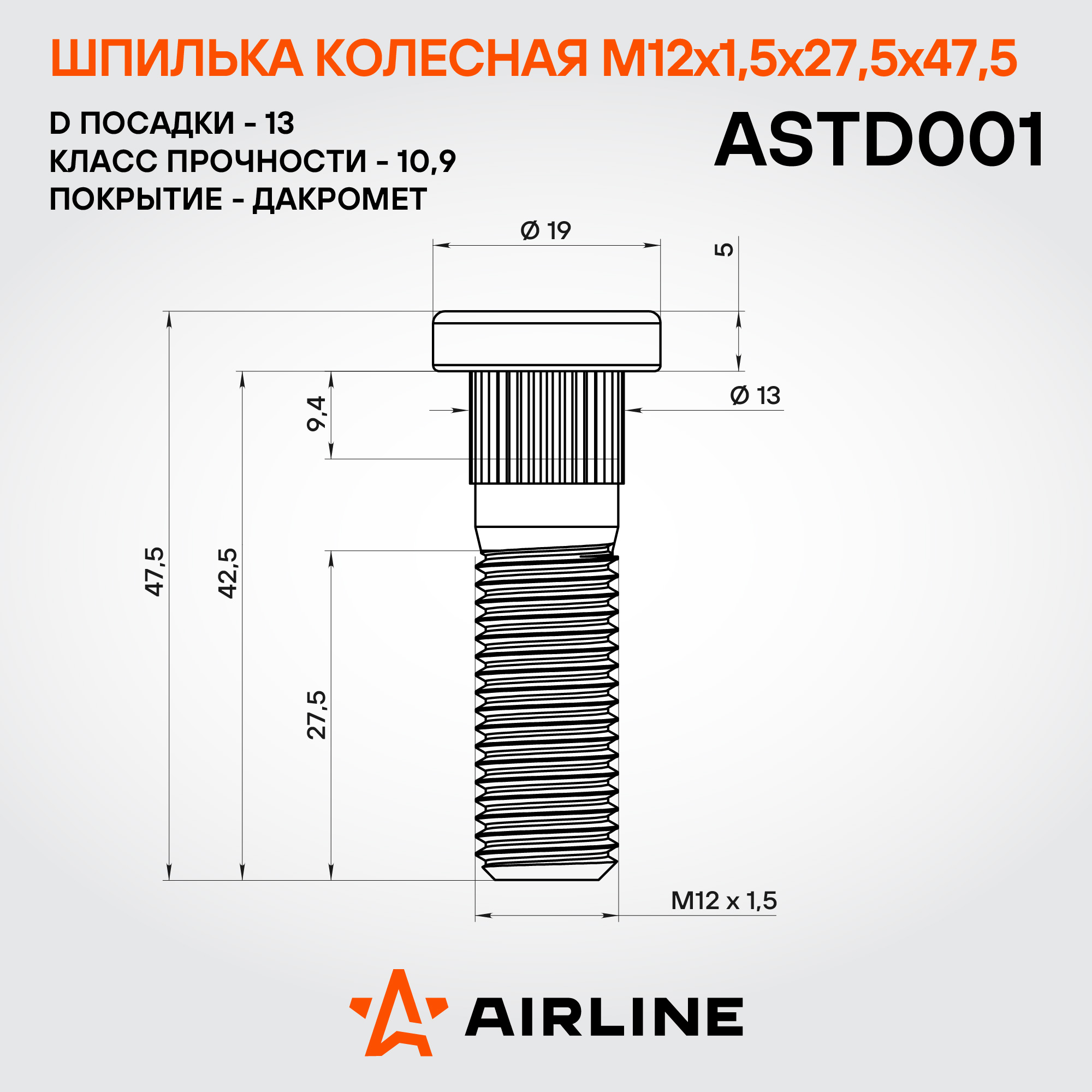 Колесная шпилька AIRLINE ASTD001 M12x1,5x27,5x47,5 с диаметром посадки 13 мм — это надежный и прочный крепежный элемент, предназначенный для безопасного и долговечного соединения колесного диска со ступицей.
