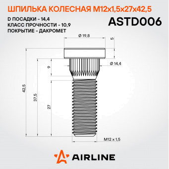 Колесная шпилька AIRLINE ASTD006 M12x1,5x27x42,5 с диаметром посадки 14,4 мм — это прочный и надежный крепежный элемент, предназначенный для безопасного соединения колесного диска со ступицей.