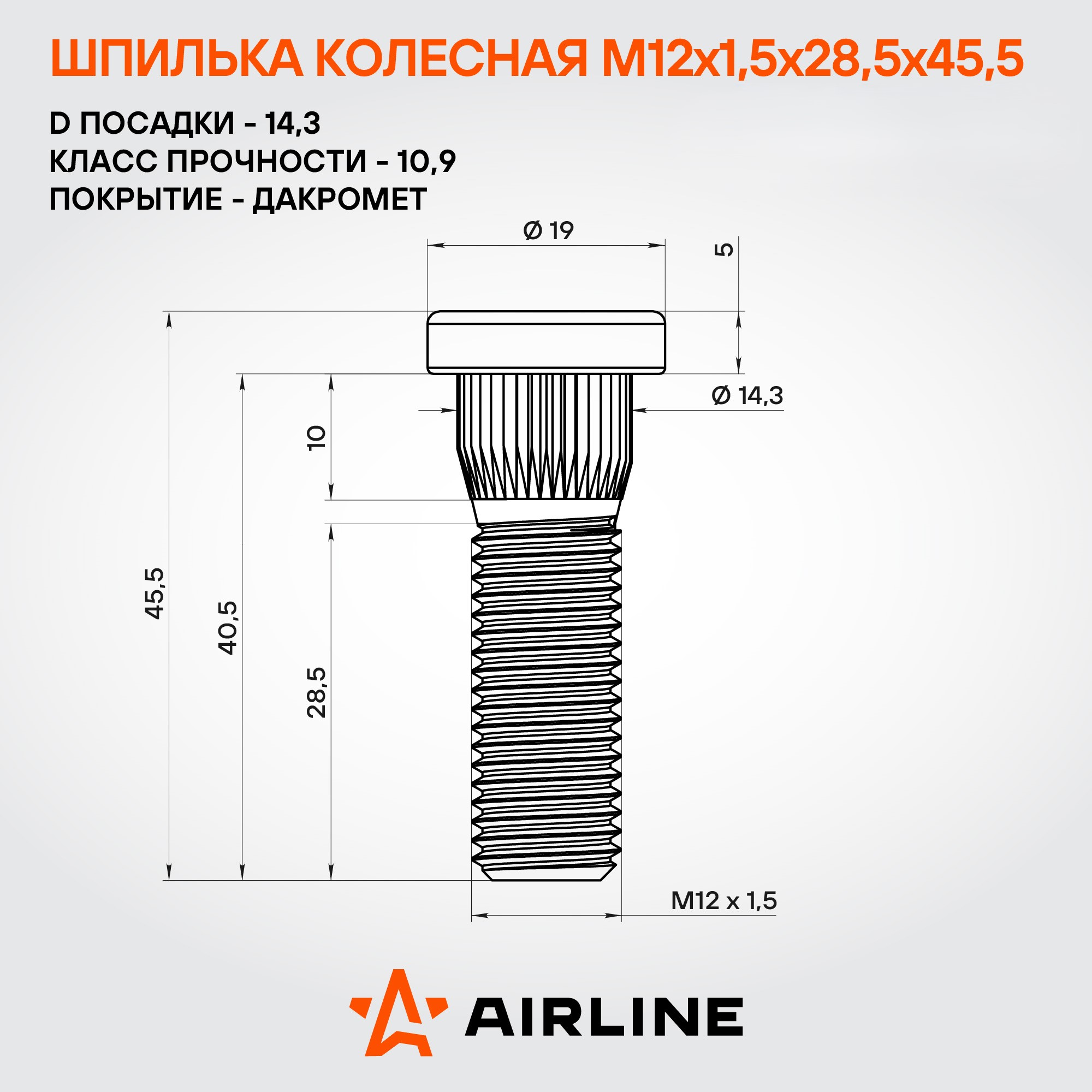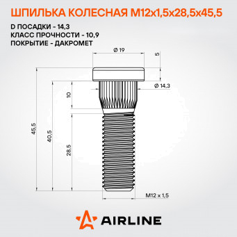 Колесная шпилька AIRLINE ASTD202 M12x1,5x28,5x45,5 с диаметром посадки 14,3 мм — это надежный и прочный крепежный элемент, предназначенный для безопасного и долговечного соединения колесного диска со ступицей.