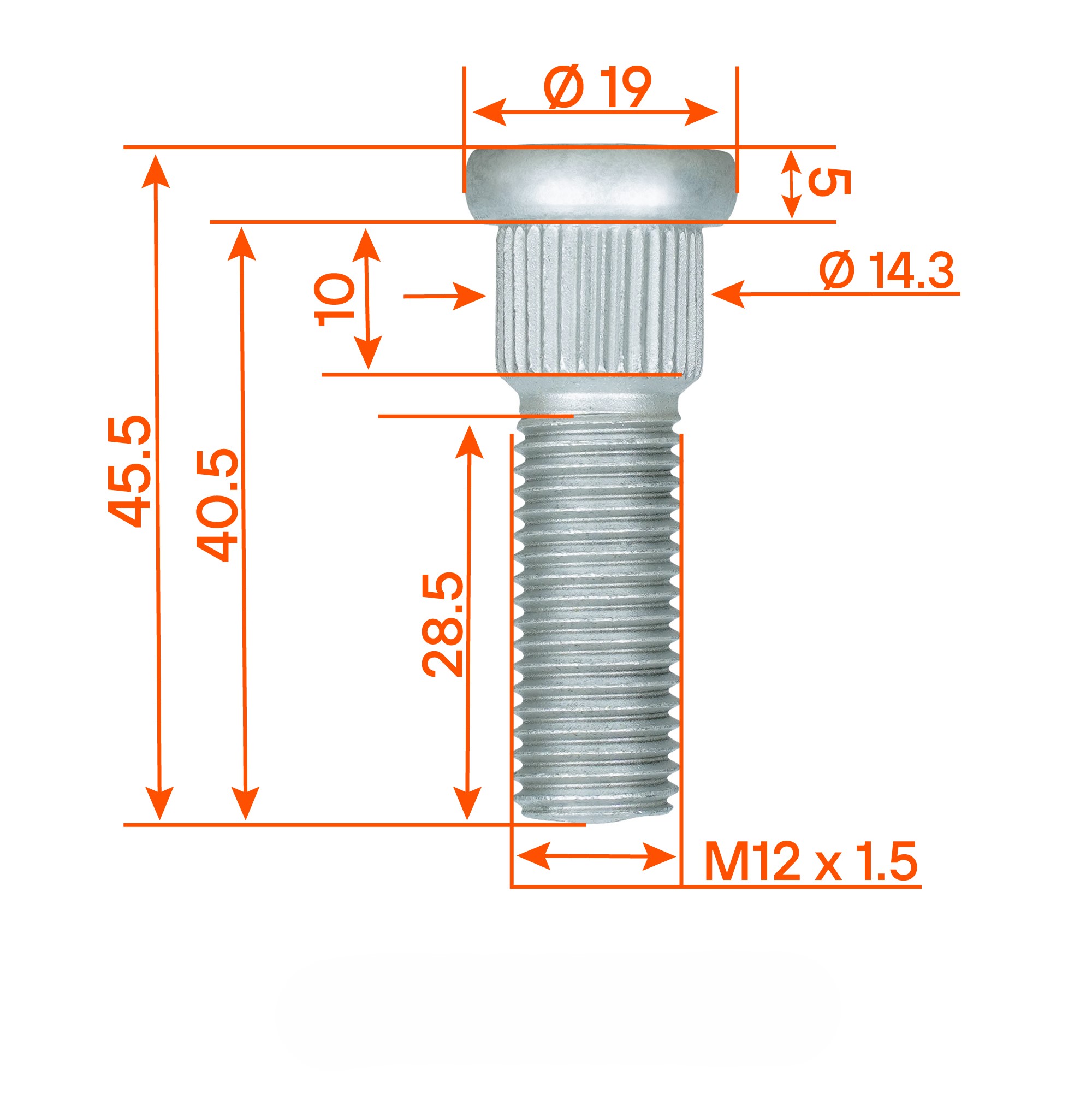 Оптимальные геометрические параметры обеспечивают идеальную посадку: резьба M12 x 1,5 длиной 28,5 мм гарантирует легкое и точное соединение с гайкой, а шлицевая часть длиной 10 мм с диаметром 14,3 мм обеспечивает прочную фиксацию в ступице без риска проворачивания.