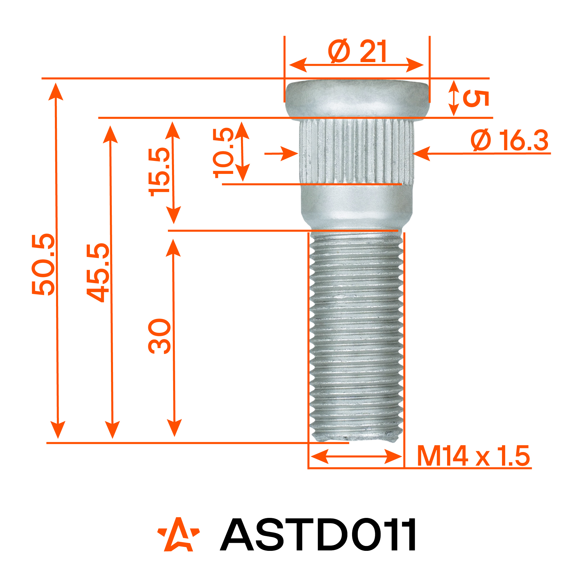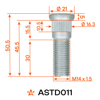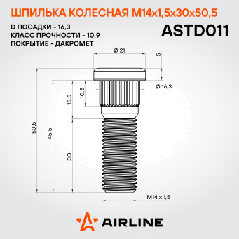 Колесная шпилька AIRLINE ASTD011 M14x1,5x30x50,5 с диаметром посадки 16,3 мм — это усиленный крепежный элемент, разработанный для надежной фиксации колесного диска к ступице при высоких нагрузках.