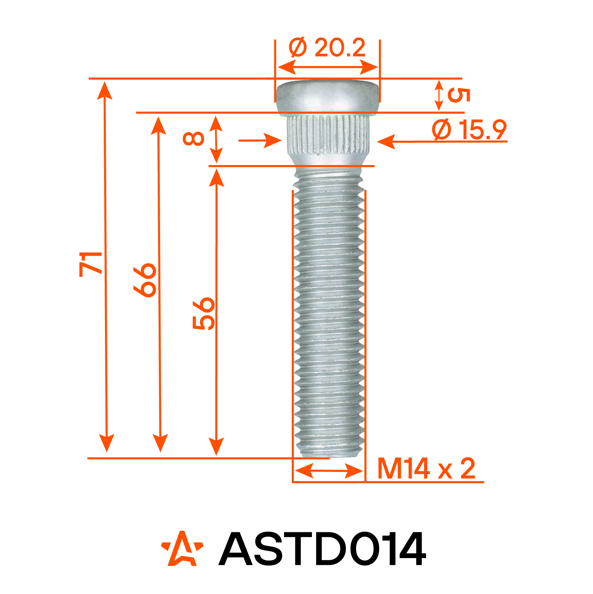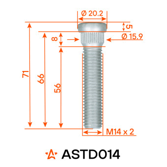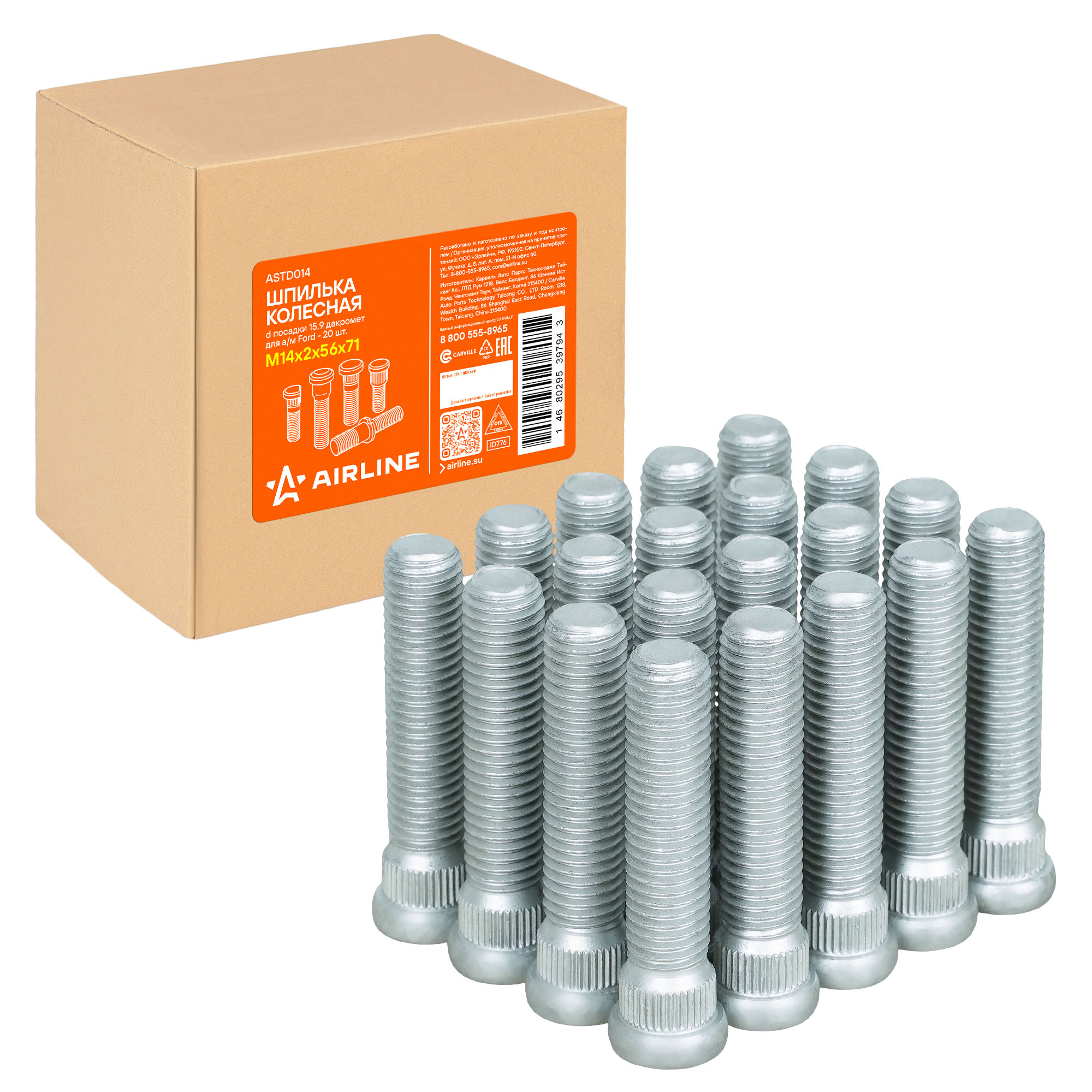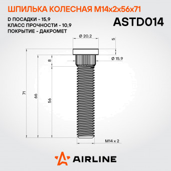 Колесная шпилька AIRLINE ASTD014 M14x2x56x71 с диаметром посадки 15,9 мм — это усиленный крепежный элемент, предназначенный для надежной фиксации колесного диска к ступице при эксплуатации в условиях повышенных нагрузок и агрессивной внешней среды.