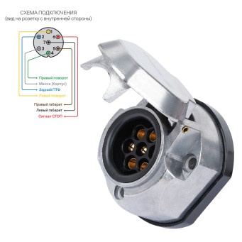 Корпус розетки выполнен из металла. Электрические разъёмы из латуни обеспечивают надёжный контакт. Резиновые уплотнители защищают от грязи и влаги. Провода и клеммы, входящие в комплект, позволяют без порчи штатной проводки автомобиля подключиться к проводам левого и правого фонарей.