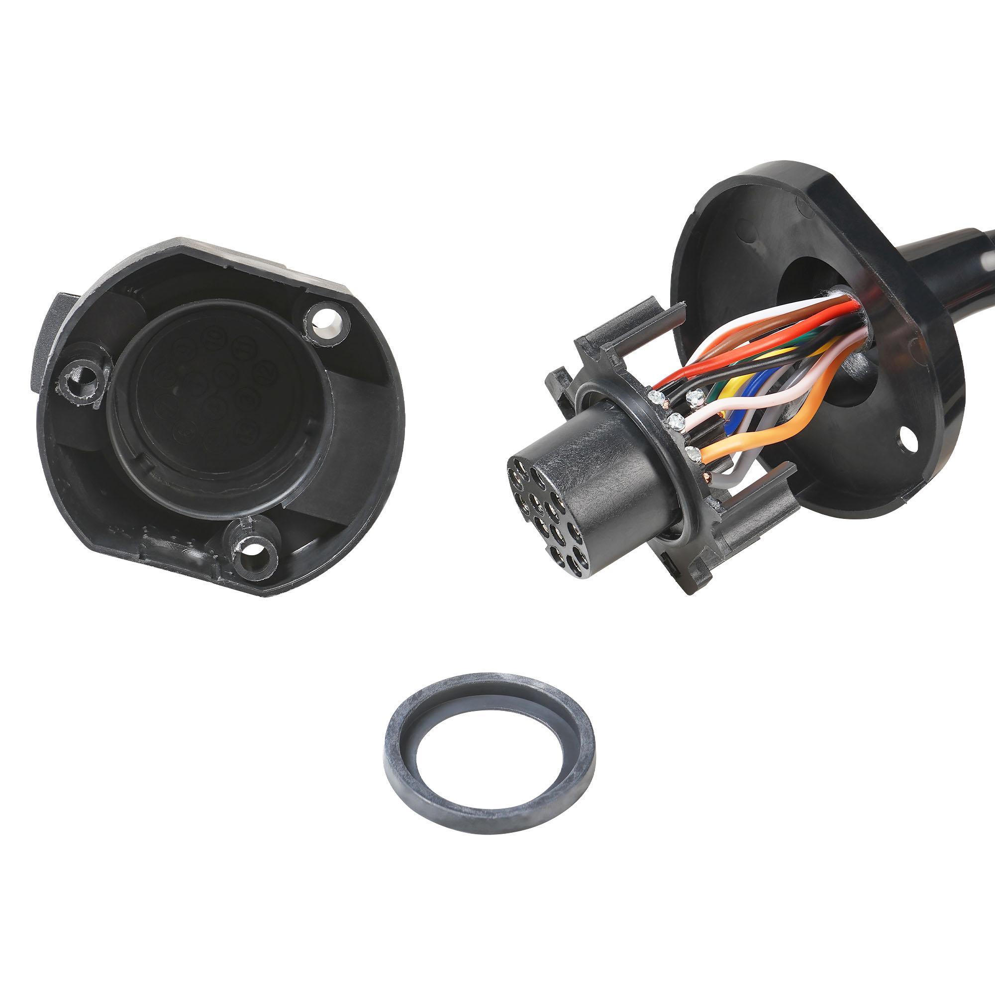 Корпус розетки выполнен из прочного пластика. Электрические разъёмы из латуни обеспечивают надёжный контакт. Резиновые уплотнители защищают от грязи и влаги. Провода и клеммы, входящие в комплект, позволяют без порчи штатной проводки автомобиля подключиться к проводам левого и правого фонарей.