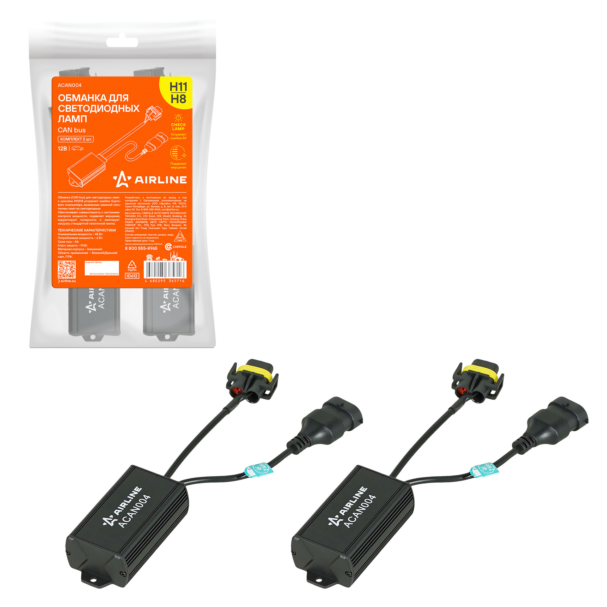 Обманка (CAN bus) AIRLINE ACAN104 для светодиодных ламп с цоколем H11/H8 предназначена для корректной работы осветительных приборов в автомобилях, оснащенных системой контроля исправности ламп.