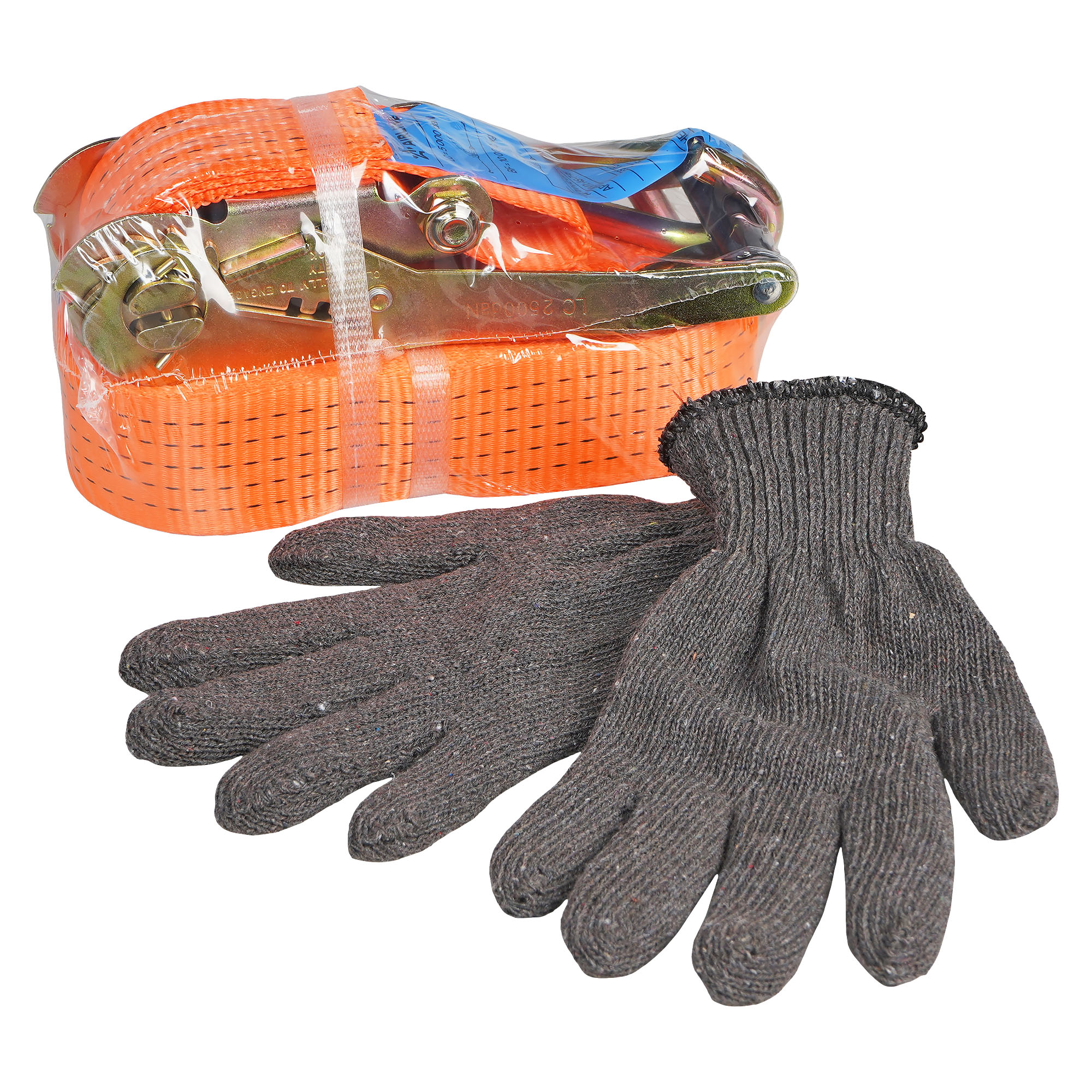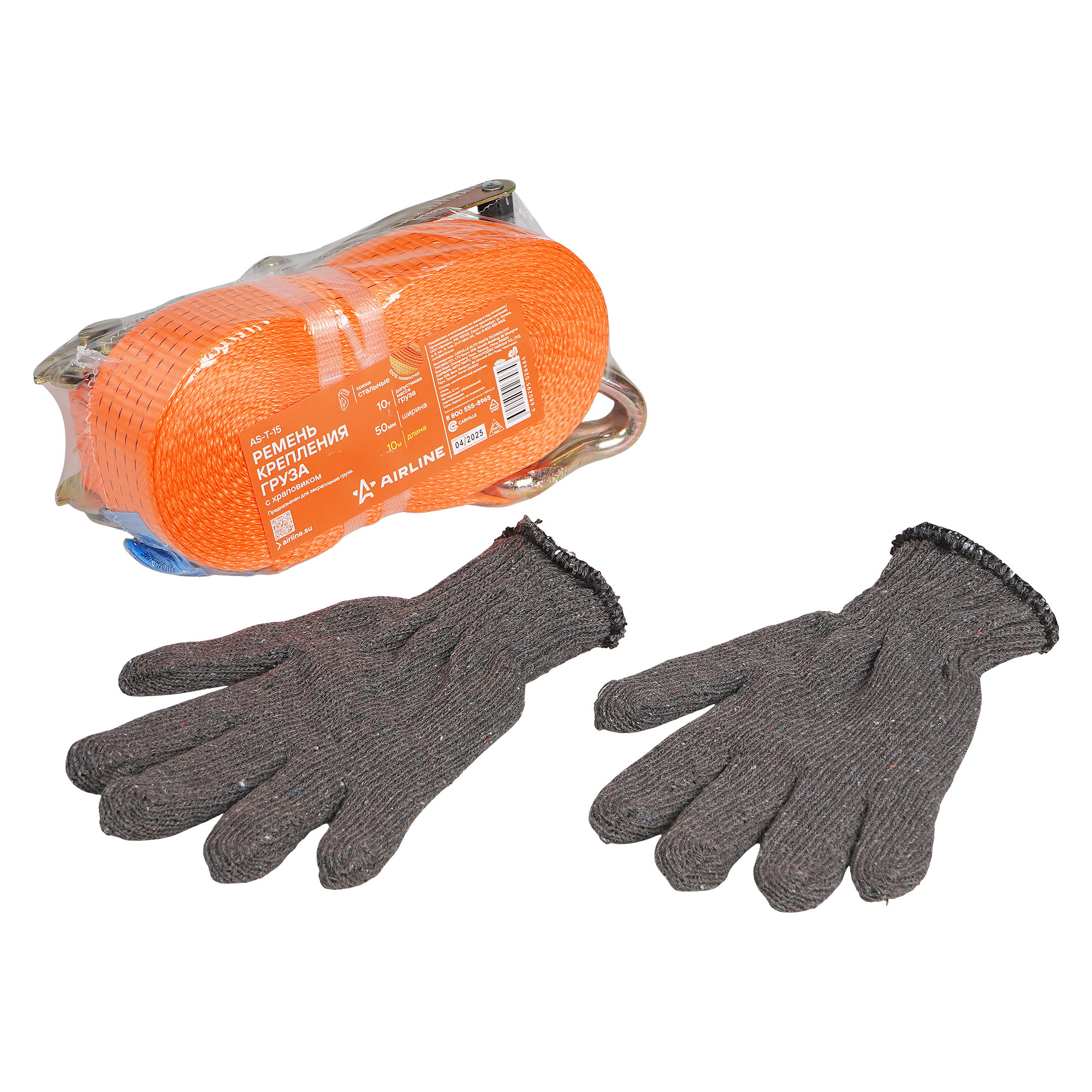 Комплект дополнен трикотажными хлопчатобумажными перчатками (1 пара) — серые. Перчатки обеспечивают защиту рук при работе с грузом, повышают удобство и безопасность при фиксации ремня, особенно в условиях низких температур или при длительном использовании.