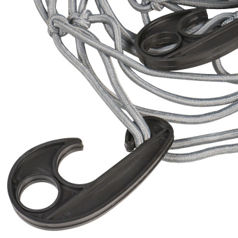 Для надежной фиксации багажной сетки служат 12 крючков, изготовленных из прочного пластика. Эти крючки легко и безопасно крепятся к различным точкам в салоне или на борту транспортного средства. Пластиковые крючки специально разработаны так, чтобы не царапать или повреждать лакокрасочное покрытие автомобиля.