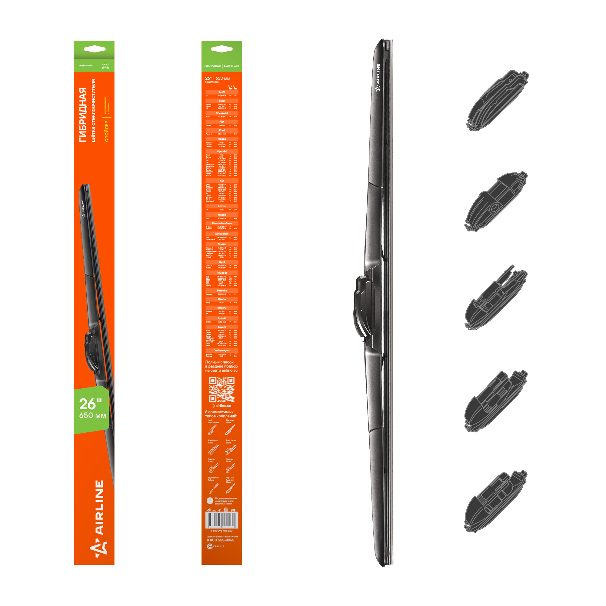 В комплект входят пять адаптеров, подходящих для разных типов креплений, что делает щетки универсальными и удобными в установке. Они долговечны, обеспечивают надежное прилегание к стеклу и эффективны как в зимних, так и в летних условиях.