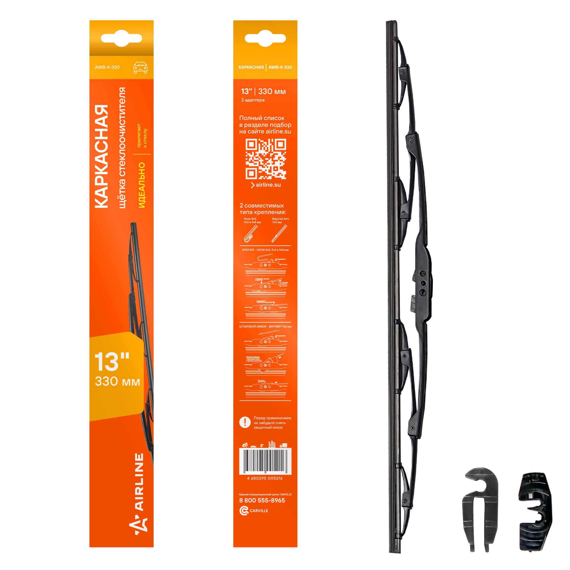 Каркасная конструкция щетки стеклоочистителя — это качество, проверенное десятилетиями. Такие щетки являются самыми доступными по цене, обладает высокой прочностью, и лучшими показателями прилегания резинок к стеклу автомобиля. К классической форме щетки производители AIRLINE добавили изменения в составе резины, позволяющие продлить ее срок использования. В комплект добавленны адаптеры подходящие для 2-х типов крепления: "крючок" HOOK 9x3/9x4 и HOOK 8x3 для установки на самые распространенные марки автомобиля.
