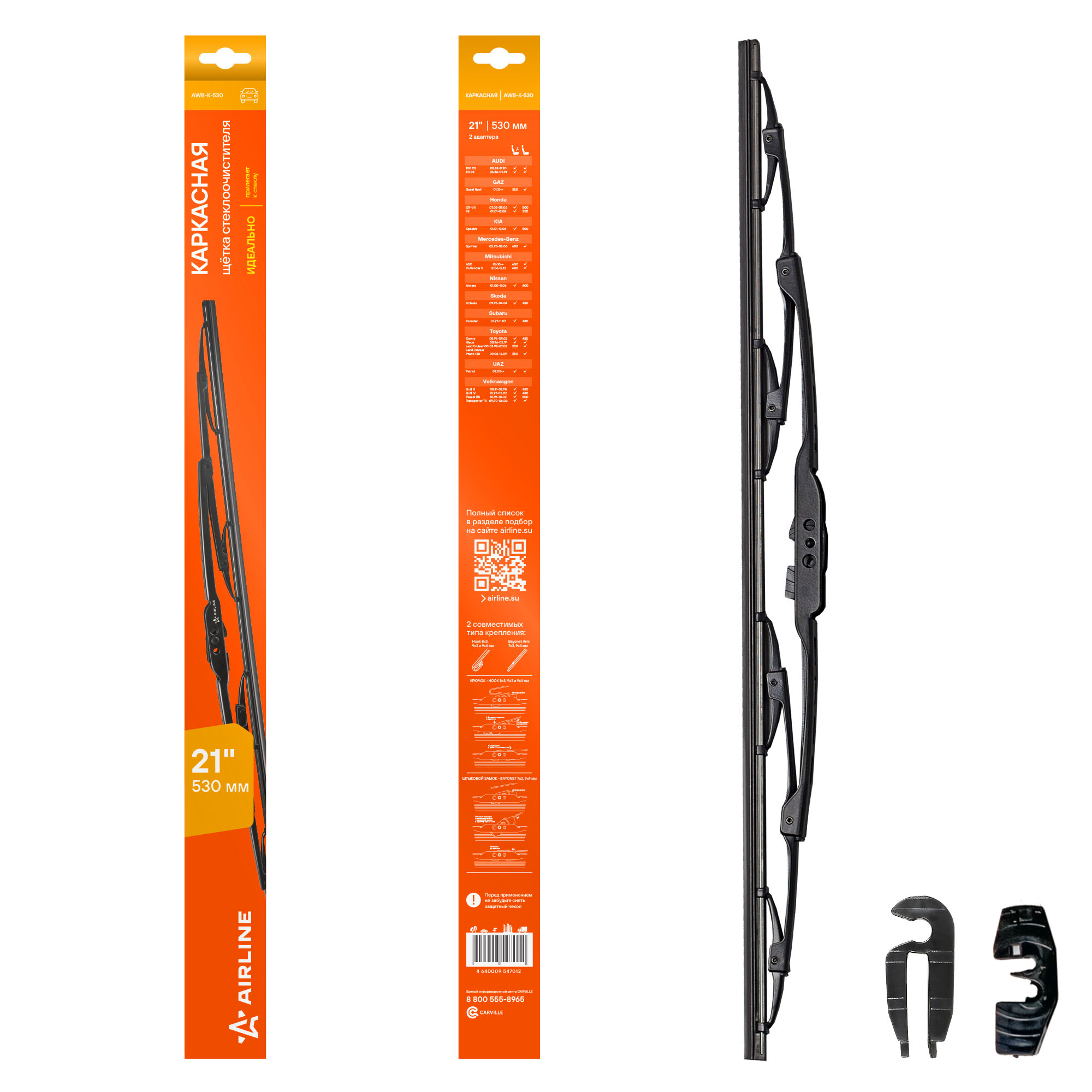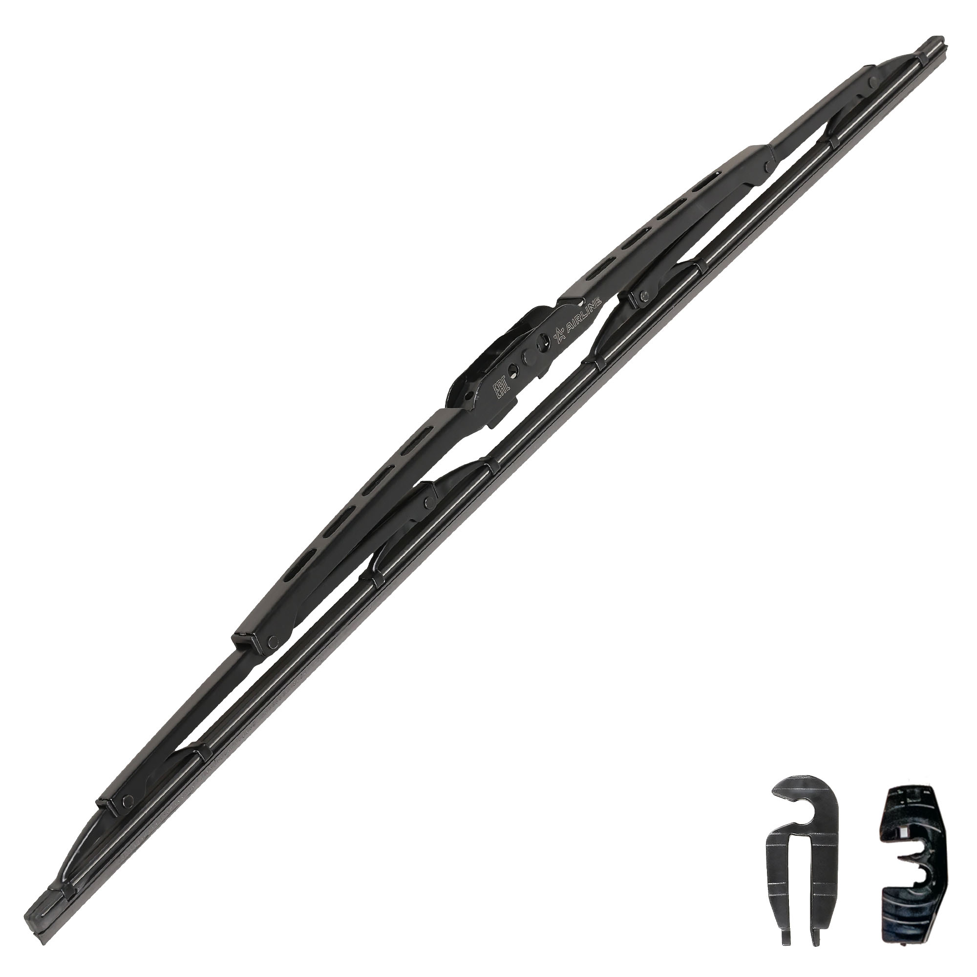 Каркасная конструкция щетки стеклоочистителя — это качество, проверенное десятилетиями. Такие щетки являются самыми доступными по цене, обладает высокой прочностью, и лучшими показателями прилегания резинок к стеклу автомобиля. К классической форме щетки производители AIRLINE добавили изменения в составе резины, позволяющие продлить ее срок использования. В комплект добавленны адаптеры подходящие для 2-х типов крепления: "крючок" HOOK 9x3/9x4 и HOOK 8x3 для установки на самые распространенные марки автомобиля.