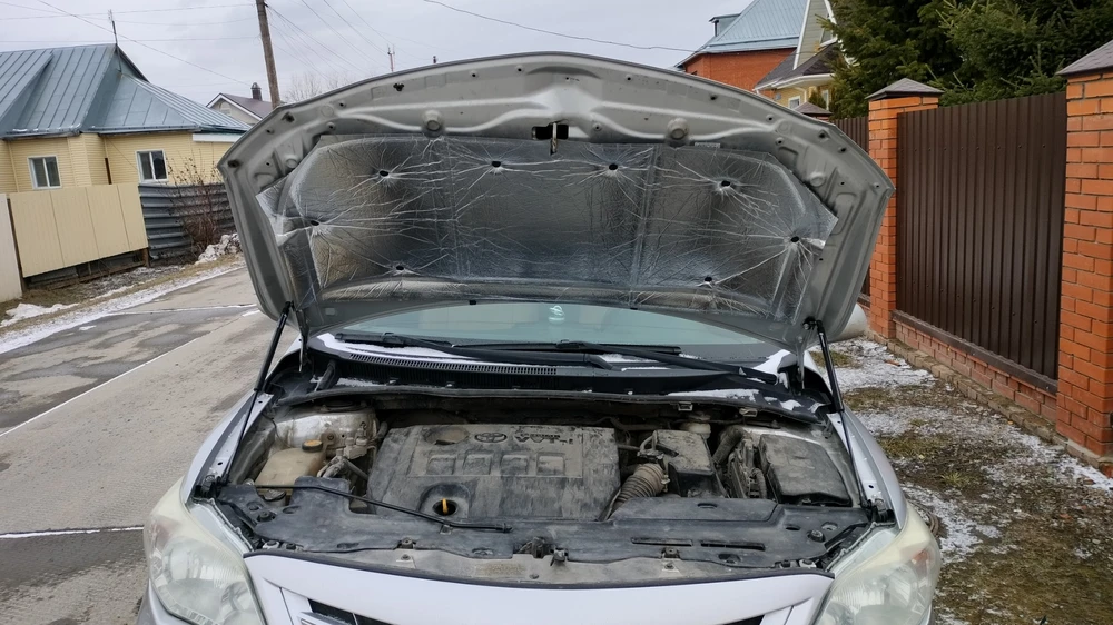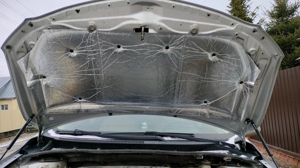 Монтаж: Шумоизоляцию необходимо подогнать по размеру штатного установочного места и прикрепить, при помощи входящих в комплект клипс (пистонов). Изделие также можно просто положить фольгированной стороной поверх двигателя.