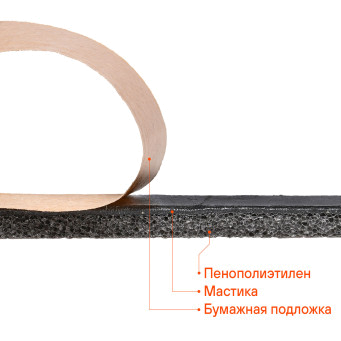 Теплозвукоизоляционный материал - вспененный пенополиэтилен с полимерным влагостойким клеевым слоем. Толщина мастичного клеевого слоя 2 мм и его вязкопластичные характеристики придают материалу вибродемпфирующий эффект.