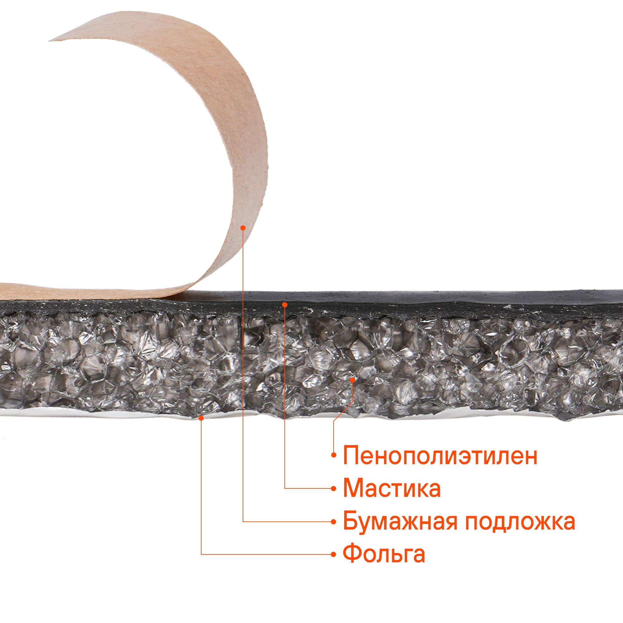 Теплозвукоизоляционный материал - покрытый алюминиевой фольгой или металлолавсаном вспененный пенополиэтилен с полимерным влагостойким клеевым слоем. Толщина мастичного клеевого слоя 2 мм и его вязкопластичные характеристики придают материалу вибродемпфирующий эффект.
