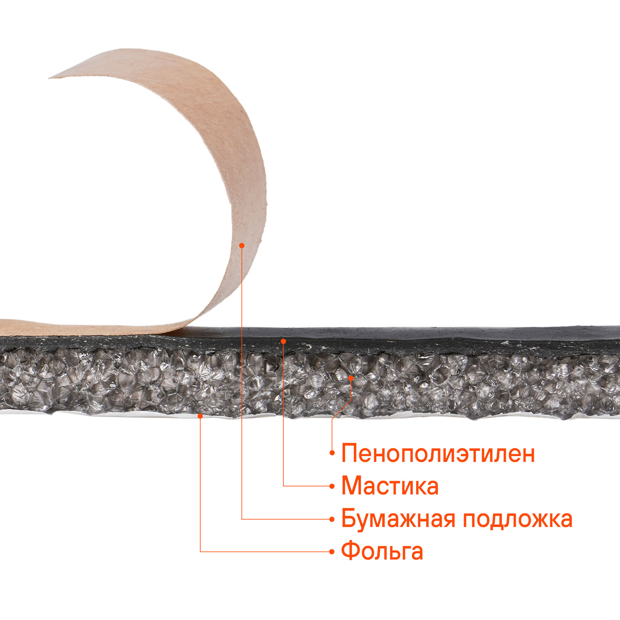 Теплозвукоизоляционный материал - покрытый алюминиевой фольгой или металлавсаном вспененный пенополиэтилен с полимерным влагостойким клеевым слоем. Толщина мастичного клеевого слоя 2мм и его вязкопластичные характеристики придают материалу вибродемпфирующий эффект.