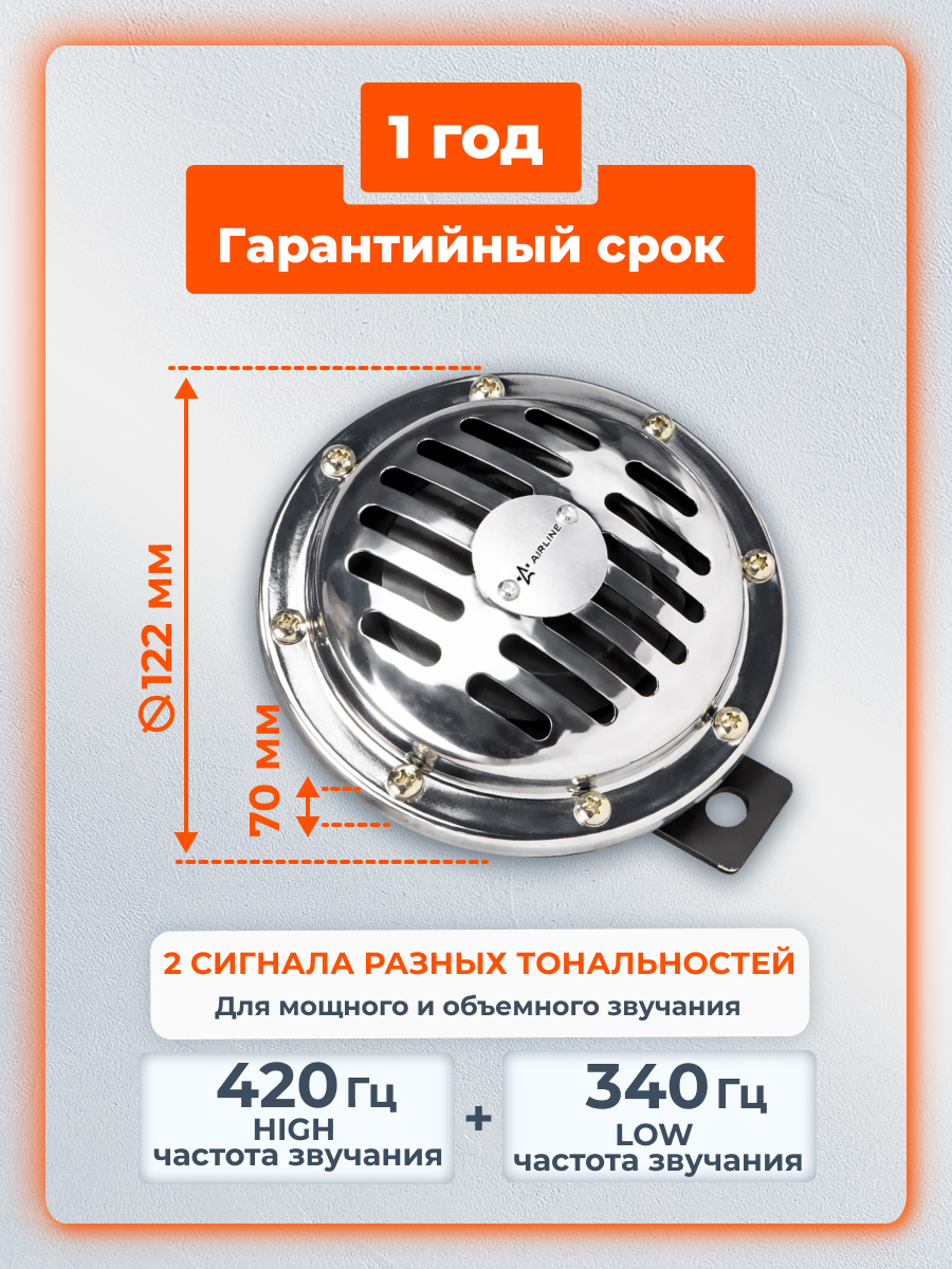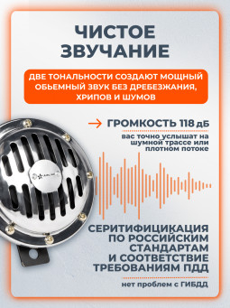 Комплект дисковых звуковых сигналов большого диаметра. Сигналы имеют инновационный дизайн и высококачественное звучание, благодаря которому ваш автомобиль будет выделяться в потоке. Увеличенное до 118дБ звуковое давление и оптимально подобранные частоты звучания привлекут внимание других участников дорожного движения к вашему автомобилю.