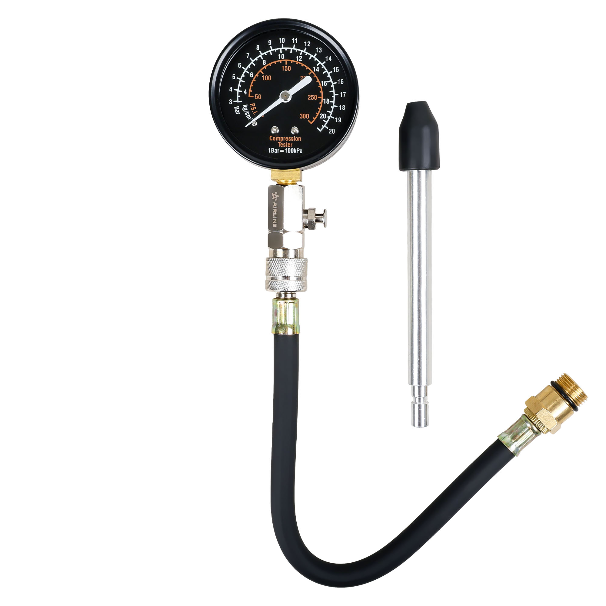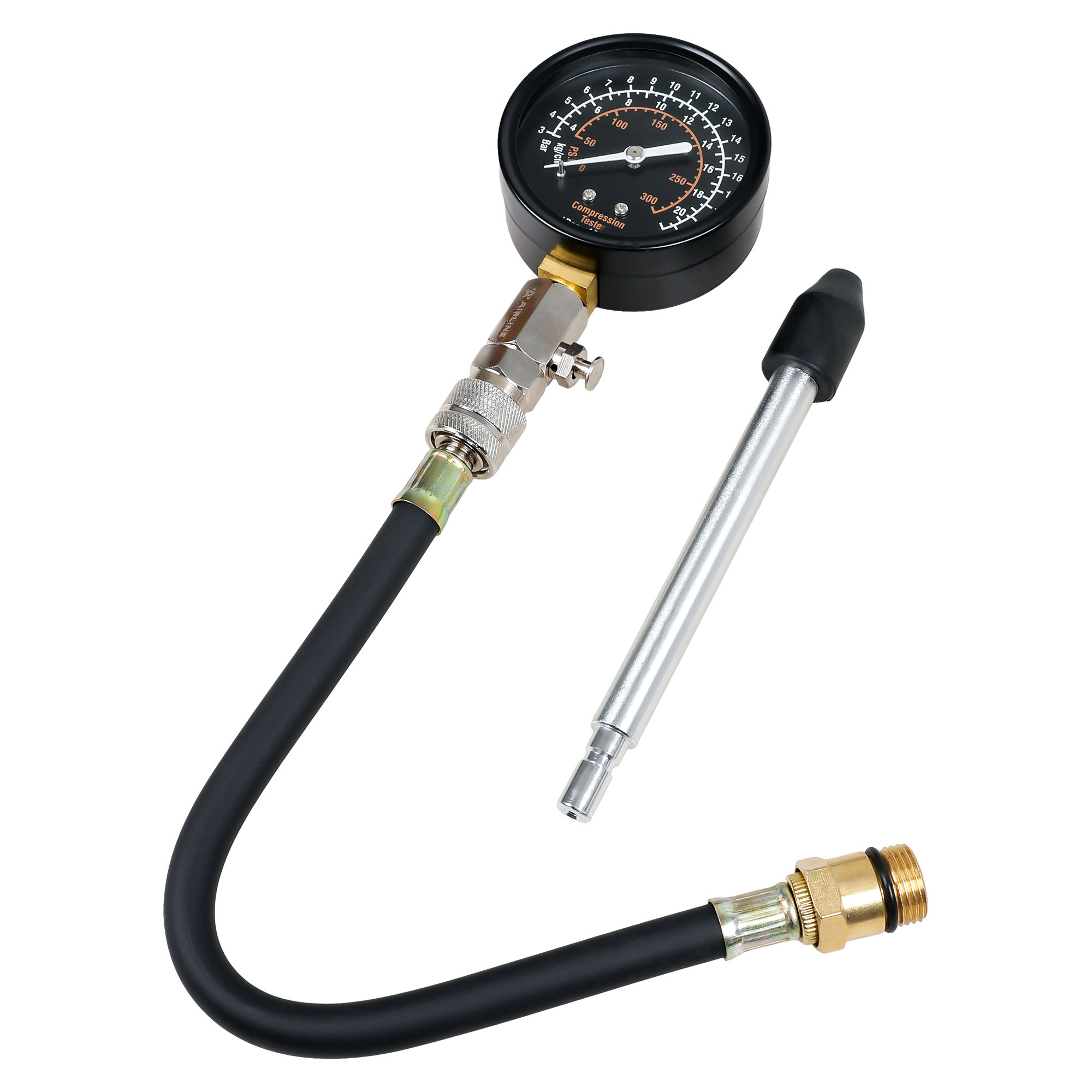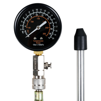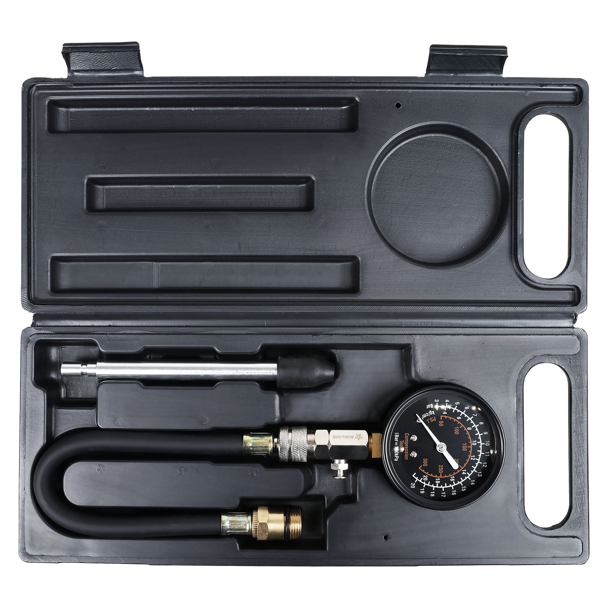 Компрессометр предназначен для измерения давления в цилиндрах бензиновых двигателей. Устройство оснащено манометром с тройной шкалой и комплектом адаптеров для различных типов свечных отверстий. Гибкий шланг обеспечивает удобство работы в труднодоступных местах. Поставляется в прочном пластиковом кейсе для хранения и транспортировки.