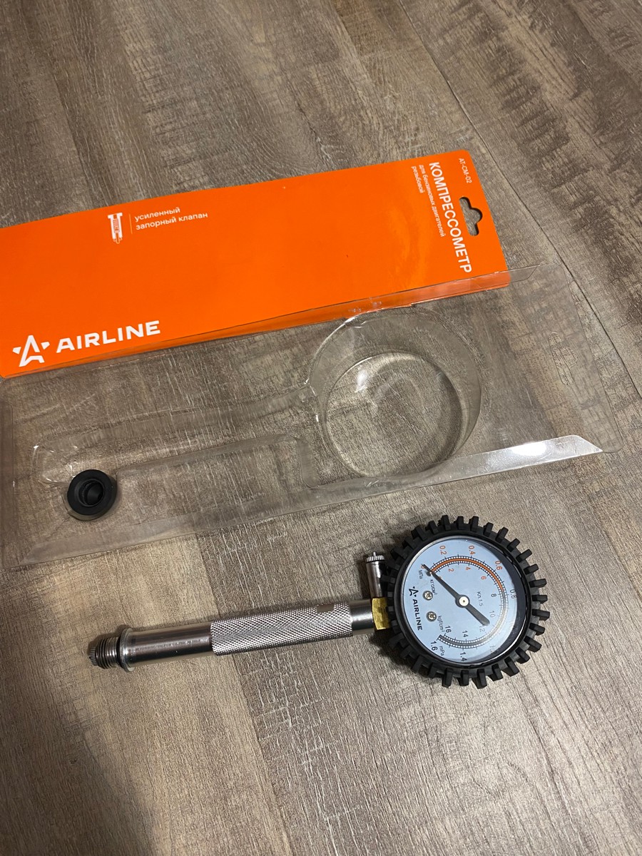 Компрессометр состоит из манометра, присоеденительного шланга с резьбовым наконечником, запорного клапана.