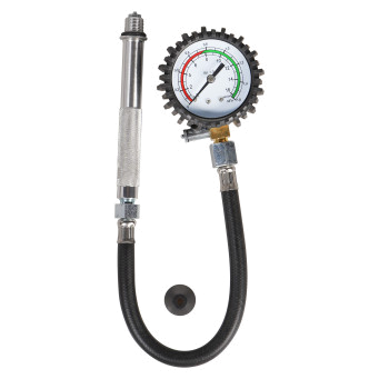 Компрессометр состоит из манометра, присоеденительного шланга с резьбовым наконечником, запорного клапана, клапана сброса давления.