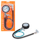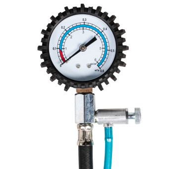 Измеритель состоит из манометра и присоединительной части. Манометр защищён резиновым чехлом.